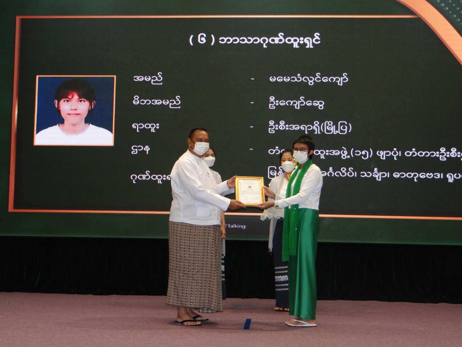 ယင်းနောက် ပြည်ထောင်စုဝန်ကြီး၏ဇနီး ဒေါ်စိမ့်နီခင် က ငါးဘာသာဂုဏ်ထူးရှင် တစ်ဦးကို ဂုဏ်ပြုဆုနှင့် ဂုဏ်ပြုမှတ်တမ်းလွှာများကိုလည်းကောင်း၊ ၂၀၂၂-၂၀၂၃ ပညာသင်နှစ် မူလတန်း၊ အလယ်တန်း၊ အထက်တန်းနှင့် တက္ကသိုလ်အဆင့် ကျောင်းများတွင် တက်ရောက် ပညာသင်ကြားလျက်ရှိသည့် ဝန်ထမ်းသား၊သမီးများအတွက် ပညာသင်ထောက်ပံ့စရိတ်များကို အဆောက်အဦ၊ လမ်း၊တံတားနှင့် မြို့ပြနှင့်အိမ်ရာဖွံ့ဖြိုးရေးဦးစီးဌာနတို့မှ ကိုယ်စားလှယ်များထံလည်းကောင်း ပေးအပ်သည်။