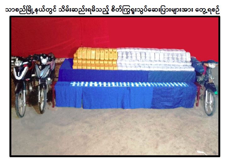 အလားတူ မူးယစ်ဆေးဝါး တားဆီးနှိမ်နင်းရေးရဲတပ်ဖွဲ့မှ တပ်ဖွဲ့ဝင်များပါဝင်သော ပူးပေါင်းအဖွဲ့သည် ဩဂုတ် ၁၀ ရက် နံနက် ၇ နာရီတွင် မန္တလေးတိုင်းဒေသကြီး၊ သာစည်မြို့နယ်၊ ကျွဲကျကျေးရွာ၊ ကျွဲကျချောင်းအနီး၌ မော်တော်ဆိုင်ကယ် ၃ စီးမှာ ဆာလာအိတ်များ တင်ဆောင်ထားပြီး ရပ်တန့်ထားသည်ကို မသင်္ကာဖွယ်တွေ့ရှိသဖြင့် ဖွင့်ဖောက်စစ်ဆေးရာ အဆိုပါဆိုင်ကယ် ၃ စီးပေါ်တွင် တင်ဆောင်ထားသည့် ဆာလာအိတ် ၁၃ အိတ်အတွင်းမှ ဒေသကာလ တန်ဖိုးငွေကျပ် ၃ ဒသမ ၆၃ ဘီလီယံတန်ဖိုးရှိ စိတ်ကြွ ရူးသွပ်ဆေးပြား ၂၄ ဒသမ ၂ သိန်း သိမ်းဆည်းရမိခဲ့သဖြင့် ၎င်းတို့အား ဥပဒေအရ အရေးယူထားရှိပြီး ကွင်းဆက် ပြစ်မှုကျူးလွန်သူများအား ဆက်လက်စစ်ဆေး ဖော်ထုတ်လျက်ရှိကြောင်း သိရသည်။
