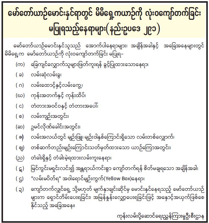 မော်တော်ယာဉ်မောင်းနှင်ရာတွင် မိမိရှေ့ကယာဉ်ကို လုံးဝကျော်တက်ခြင်း မပြုရသည့်နေရာများ(နည်းဥပဒေ ၂၉၁) 08/15/2022