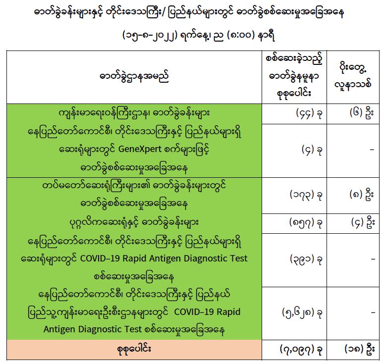 သို့ဖြစ်ပါ၍ ယနေ့အထိ ဓာတ်ခွဲနမူနာစုစုပေါင်း (၈,၆၂၄,၉၀၃)ခုအား စစ်ဆေးခဲ့ပြီး COVID-19 ဓာတ်ခွဲအတည်ပြုလူနာ စုစုပေါင်း (၆၁၄,၄၀၇) ဦး ရှိပြီဖြစ်ပါသည်။