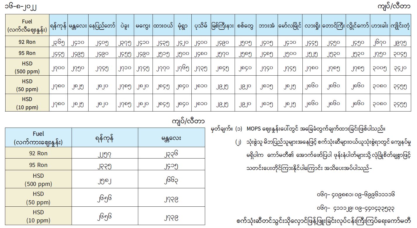 ရန်ကုန်မြို့နှင့် မန္တလေးမြို့အတွက် ရည်ညွှန်းလက်ကားဈေးနှုန်းများနှင့် ပြည်ထောင်စုနယ်မြေ နေပြည်တော်၊ တိုင်းဒေသကြီး/ပြည်နယ် မြို့တော်များအတွက် ရည်ညွှန်းလက်လီဈေးနှုန်းများ