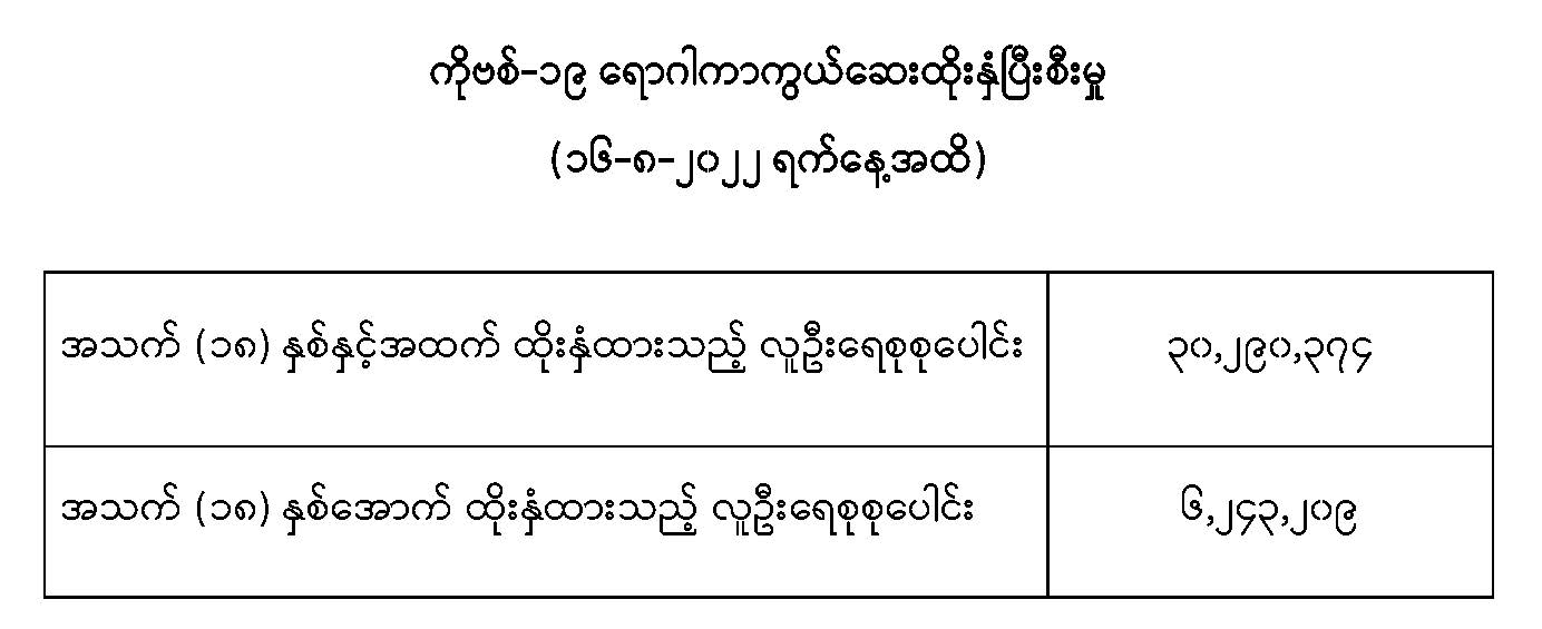 COVID-19 ရောဂါ ကာကွယ်ထိန်းချုပ်ရေးအတွက် တိုင်းဒေသကြီး/ပြည်နယ်များတွင် COVID-19 ရောဂါကာကွယ်ဆေးကို ဦးတည်အုပ်စုများသတ်မှတ်၍ ထိုးနှံပေးလျက်ရှိရာ (၁၆-၈-၂၀၂၂) ရက်နေ့ အထိ အသက် (၁၈) နှစ်နှင့်အထက် လူဦးရေစုစုပေါင်း (၃၀,၂၉၀,၃၇၄) ဦး နှင့် အသက် (၁၈) နှစ် အောက် လူဦးရေစုစုပေါင်း (၆,၂၄၃,၂၀၉) ဦး တို့အား ထိုးနှံထားရှိပြီး ဖြစ်ပါသည်။