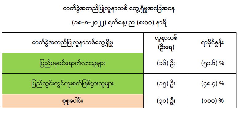 သို့ဖြစ်ပါ၍ ယနေ့အထိ ဓာတ်ခွဲနမူနာစုစုပေါင်း (၈,၆၄၇,၃၇၀) ခုအားစစ်ဆေးခဲ့ပြီး COVID-19 ဓာတ်ခွဲအတည်ပြုလူနာစုစုပေါင်း (၆၁၄,၅၄၁) ဦးရှိပြီဖြစ်ပါသည်။