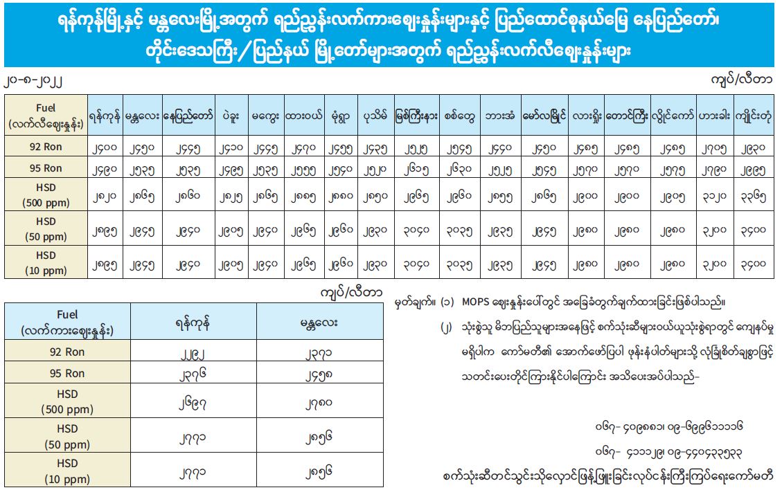 ရန်ကုန်မြို့နှင့် မန္တလေးမြို့အတွက် ရည်ညွှန်းလက်ကားဈေးနှုန်းများနှင့် ပြည်ထောင်စုနယ်မြေ နေပြည်တော်၊ တိုင်းဒေသကြီး/ပြည်နယ် မြို့တော်များအတွက် ရည်ညွှန်းလက်လီဈေးနှုန်းများ 08/20/2022