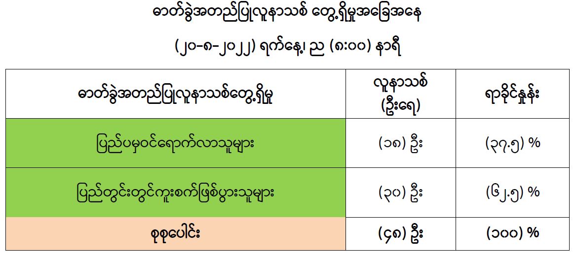 ဓာတ်ခွဲအတည်ပြုလူနာများအား နေအိမ်တွင် သီးခြားထားရှိခြင်းနှင့် ဆေးရုံများတွင် သီးခြား ထားရှိကုသမှုပေးခြင်းများ ဆောင်ရွက်ခဲ့ရာ ယနေ့တွင် ပြန်လည်ကောင်းမွန်လာသူ (၃၀) ဦး ရှိ သဖြင့် ယနေ့အထိ ပြန်လည်ကောင်းမွန်လာသူ စုစုပေါင်း (၅၉၃,၂၁၅)ဦး ရှိပြီဖြစ်ပါသည်။ ယနေ့တွင် COVID-19 ရောဂါဖြင့် သေဆုံးသူ မရှိပါသဖြင့် ယနေ့အထိ သေဆုံးသူစုစုပေါင်း (၁၉,၄၃၇) ဦး ရှိပါသည်။