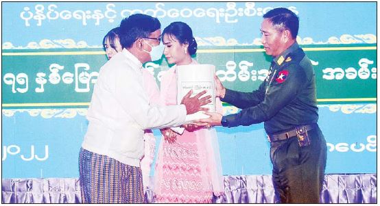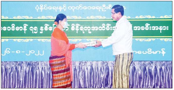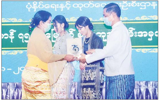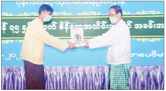 ဆက်လက်၍ တပ်မတော်(ကြည်း၊ ရေ၊ လေ)မိသားစုများက တက်ရောက်လာကြသည့် စာပေပညာရှင်ကြီးများအား လှူဒါန်းသည့်လက်ဆောင်ပစ္စည်းများကို ကာကွယ်ရေးဦးစီးချုပ်ရုံး (ကြည်း)မှ ဒုတိယဗိုလ်ချုပ်ကြီး သက်ပုံက ပေးအပ်ရာ ဆရာကြီး ဒေါက်တာမောင်သင်း(မောင်သင်း-သပြေ)က လက်ခံရယူသည်။