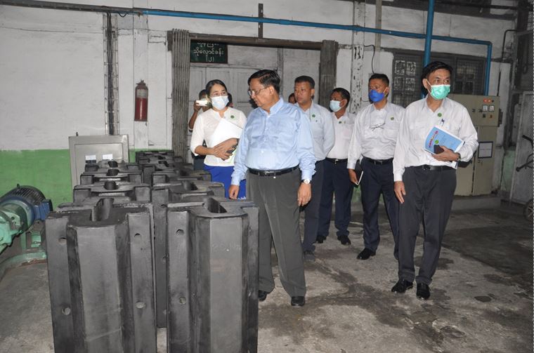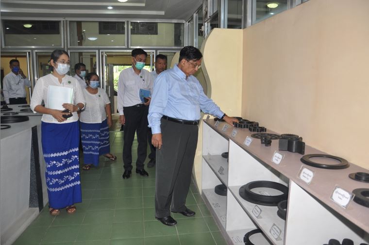 ယနေ့နံနက်ပိုင်းတွင် ပြည်ထောင်စုဝန်ကြီးသည် သင်္ဃန်းကျွန်းမြို့နယ်ရှိ ရာဘာပစ္စည်း စက်ရုံခွဲ(သင်္ဃန်းကျွန်း)သို့ ရောက်ရှိပြီး စက်မှုလုပ်ငန်းများအတွက် ရာဘာထုတ်ကုန် ပစ္စည်းများသည် မရှိမဖြစ်လိုအပ်သဖြင့် ထုတ်ကုန်အမယ်သစ်များ ထုတ်လုပ်နိုင်ရေးကြိုးစား ဆောင်ရွက်ရန်၊ ရာဘာပစ္စည်းထုတ်လုပ်မှုခေတ်မီနည်းပညာများ ရရှိရေးလေ့လာသင်ယူသွားရန်၊ စက်ရုံမှ ရာဘာပစ္စည်းထုတ်ကုန်များ တိုးမြှင့်ထုတ်လုပ်နိုင်ရေးအတွက် ဆက်စပ်ဝန်ကြီးဌာနများနှင့် ညှိနှိုင်းဆောင်ရွက်ရန်မှာကြားပြီး စက်ရုံအတွင်း မြန်မာ့ဆိပ်ကမ်းအာဏာပိုင်မှ မှာယူထားသည့် ရာဘာ Fender များ ထုတ်လုပ်နေမှုလုပ်ငန်းစဉ်အဆင့်ဆင့်နှင့် စက်ရုံမှထုတ်လုပ်သည့် ရာဘာထုတ်ကုန်ပစ္စည်းများကို ကြည့်ရှုစစ်ဆေးသည်။