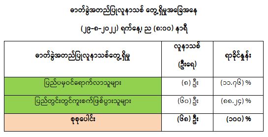 COVID-19 သံသယလူနာများ၊ ဓာတ်ခွဲအတည်ပြုလူနာနှင့် အနီးကပ်ထိတွေ့ခဲ့သူများနှင့် အသွားအလာကန့်သတ်ထားရှိသူများအား COVID-19 ရောဂါ ရှိ၊ မရှိ ဓာတ်ခွဲစစ်ဆေးခြင်း ပုံမှန်ဆောင်ရွက်လျက်ရှိပြီး (၂၈-၈-၂၀၂၂) ရက်နေ့၊ ည (၈:၀၀) နာရီမှ (၂၉-၈-၂၀၂၂) ရက်နေ့၊ ည (၈:၀၀) နာရီအတွင်း ဓာတ်ခွဲနမူနာစုစုပေါင်း (၇,၉၁၈) ခုအား စစ်ဆေးပြီးစီးခဲ့ရာ COVID-19 ရောဂါ ဓာတ်ခွဲအတည်ပြုလူနာသစ် (၆၈) ဦး တွေ့ရှိရပါသည်။ ထို့ကြောင့် ယနေ့အတွက် ရောဂါပိုးတွေ့ရှိမှု ရာခိုင်နှုန်းမှာ (၀.၈၆) ရာခိုင်နှုန်း ရှိပါသည်။ ယနေ့တွေ့ရှိသော COVID-19 ရောဂါ ဓာတ်ခွဲအတည်ပြု လူနာသစ် (၆၈) ဦးအနက် (၈) ဦး၊ (၁၁.၇၆) ရာခိုင်နှုန်းမှာ ပြည်ပမှဝင်ရောက်လာသူများအား ဓာတ်ခွဲစစ်ဆေးရာမှ တွေ့ရှိခြင်းဖြစ်ပြီး (၆၀) ဦး၊ (၈၈.၂၄) ရာခိုင်နှုန်းမှာ ပြည်တွင်းတွင် ကူးစက်ဖြစ်ပွားသူများ ဖြစ်ပါသည်။