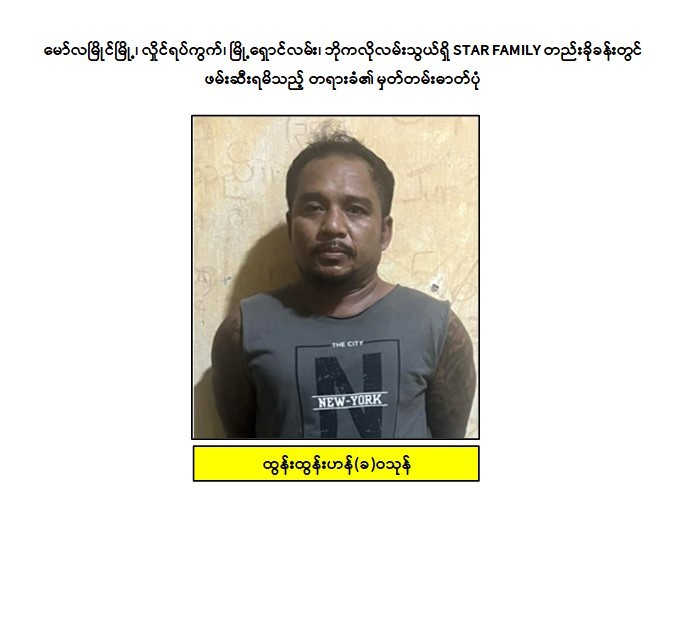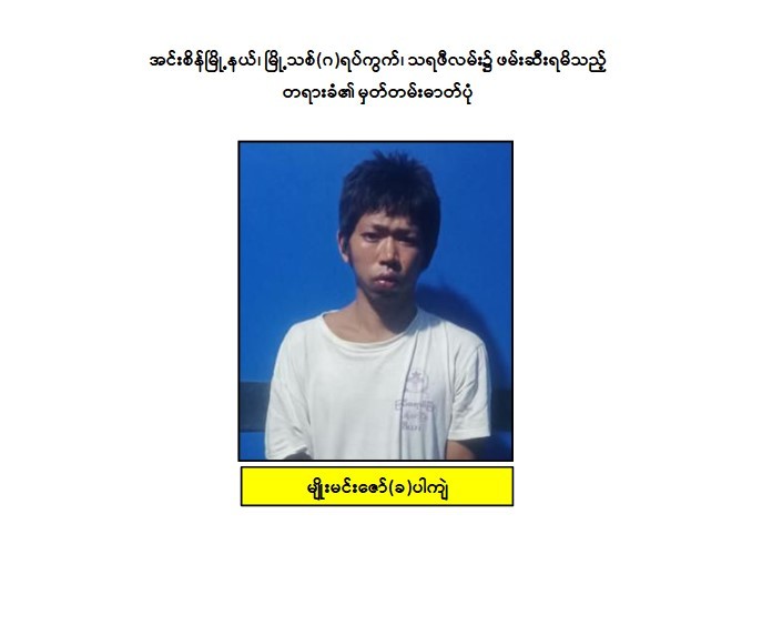 သို့ဖြစ်ပါ၍ ဖမ်းဆီးရမိတရားခံများအား ဥပဒေအရထိရောက်စွာ အရေးယူနိုင်ရေး ဆက်လက်ဆောင်ရွက်သွားမည်ဖြစ်ပြီး အကြမ်းဖက်မှု ဆောင်ရွက်နေသူများအား ပြည်သူ တစ်ရပ်လုံးက ဝိုင်းဝန်းကာကွယ်တိုက်ဖျက်ကြရန်နှင့် ပြစ်မှုကျူးလွန်ရာတွင် ပါဝင်ပတ်သက်သူများ၊ နောက်ကွယ်မှ ထောက်ပံ့ပေးလျက်ရှိသော ဆက်စပ်တရားခံများအား အမြန်ဆုံးဖမ်းဆီးရမိရေးအတွက် ၎င်းတို့ပုန်းခိုရာနေရာများ၊ လှုပ်ရှားသွားလာနေထိုင်မှု သတင်းများရရှိပါက သက်ဆိုင်ရာသို့ လျှို့ဝှက်စွာ သတင်းပေးတိုင်ကြားနိုင်ပါကြောင်း၊ သတင်းပေးသူနှင့် ဖမ်းဆီးပေးသူများအား ထိုက်တန်စွာလျှို့ဝှက်၍ ဆုငွေများချီးမြှင့် ပေးလျက်ရှိကြောင်းနှင့် မြို့ရွာများ အမြန်ဆုံး အေးချမ်းတည်ငြိမ်ရေးအတွက် ပြည်သူ တစ်ရပ်လုံး ပူးပေါင်းပါဝင်ကြိုးပမ်း ဆောင်ရွက်နိုင်ပါရန် မေတ္တာရပ်ခံအပ်ပါကြောင်း အသိပေး သတင်းထုတ်ပြန်အပ်ပါသည်။