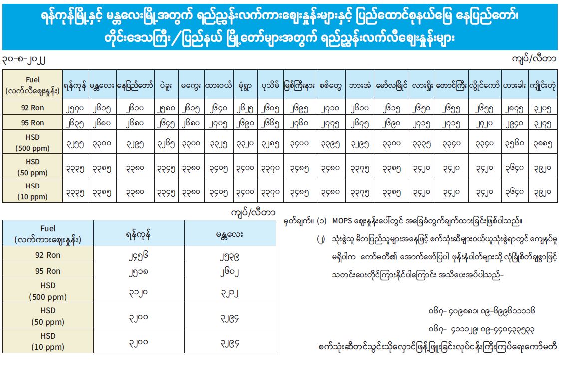 ရန်ကုန်မြို့နှင့် မန္တလေးမြို့အတွက် ရည်ညွှန်းလက်ကားဈေးနှုန်းများနှင့် ပြည်ထောင်စုနယ်မြေ နေပြည်တော်၊ တိုင်းဒေသကြီး/ပြည်နယ် မြို့တော်များအတွက် ရည်ညွှန်းလက်လီဈေးနှုန်းများ 08/30/2022