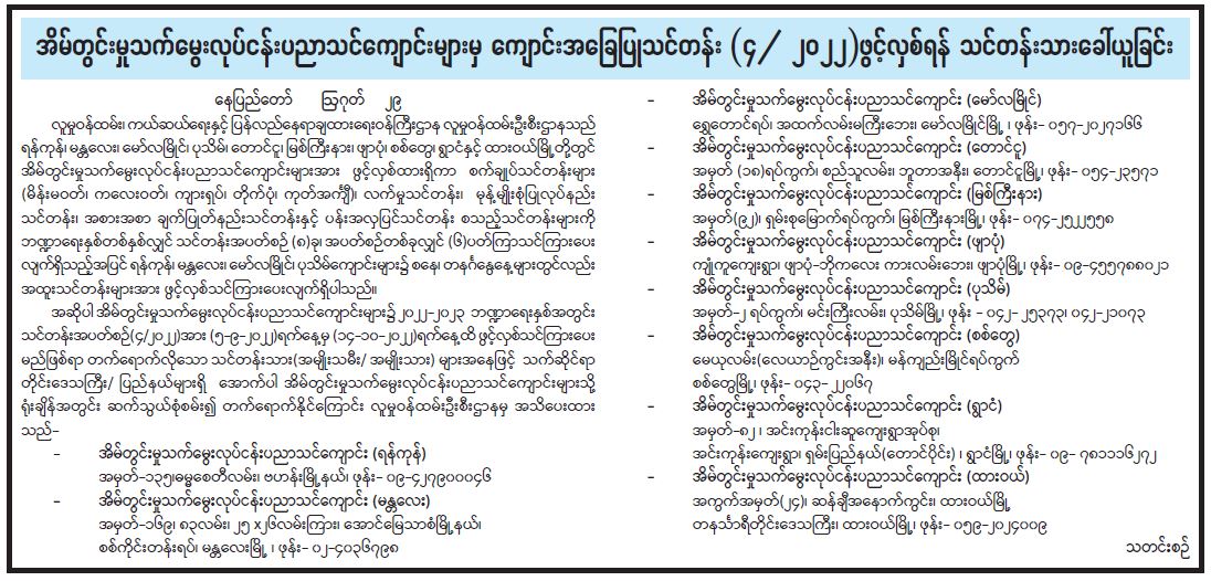 အိမ်တွင်းမှုသက်မွေးလုပ်ငန်းပညာသင်ကျောင်းများမှ ကျောင်းအခြေပြုသင်တန်း (၄/ ၂၀၂၂) ဖွင့်လှစ်ရန် သင်တန်းသားခေါ်ယူခြင်း 08/30/2022