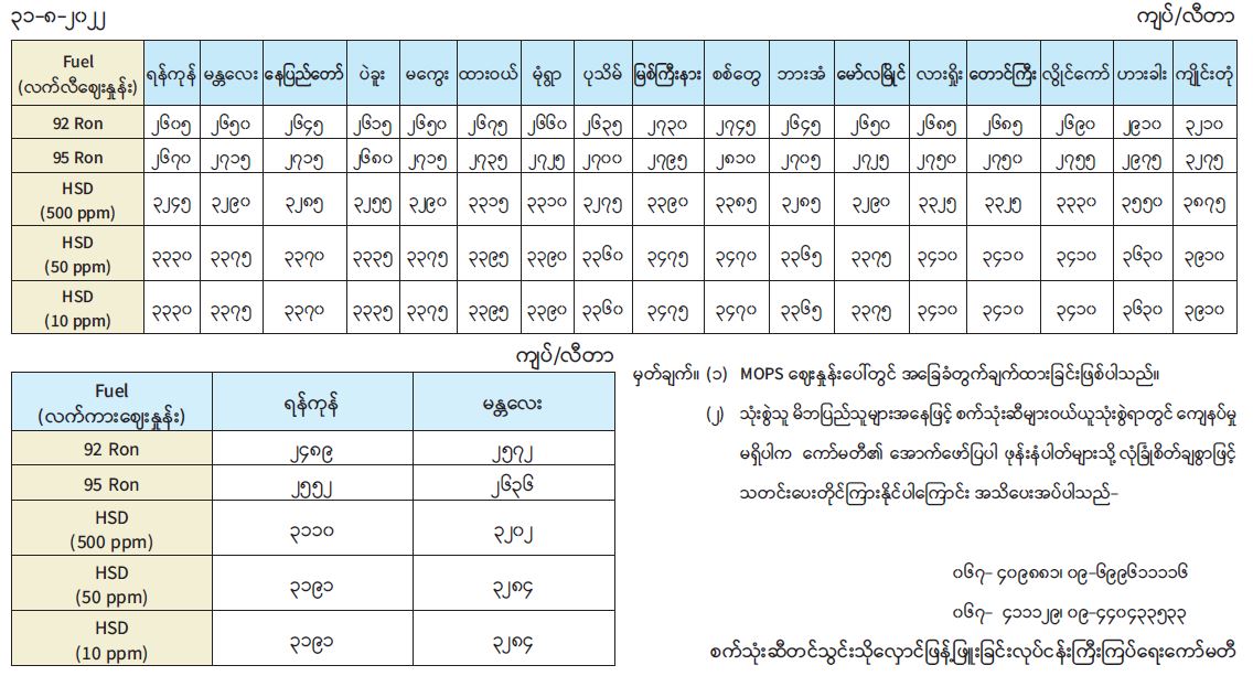 ရန်ကုန်မြို့နှင့် မန္တလေးမြို့အတွက် ရည်ညွှန်းလက်ကားဈေးနှုန်းများနှင့် ပြည်ထောင်စုနယ်မြေ နေပြည်တော်၊ တိုင်းဒေသကြီး/ ပြည်နယ် မြို့တော်များအတွက် ရည်ညွှန်းလက်လီဈေးနှုန်းများ