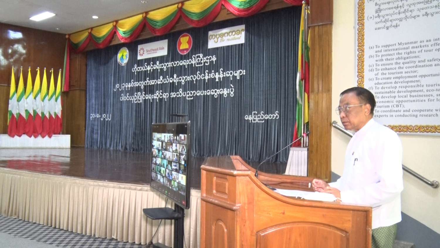 မြန်မာနိုင်ငံအနေဖြင့် ၂၀၂၃ ခုနှစ်အတွက် အာဆီယံခရီးသွား လုပ်ငန်းစံနှုန်းဆုများ ပါဝင်ယှဉ်ပြိုင်ရေး အသိပညာပေးဆွေးနွေးပွဲကို ယနေ့နံနက်ပိုင်းတွင် ဟိုတယ်နှင့်ခရီးသွားလာရေးဝန်ကြီးဌာန၊ ကျောက်စိမ်းခန်းမ၌ Hybrid စနစ်ဖြင့် ကျင်းပသည်။