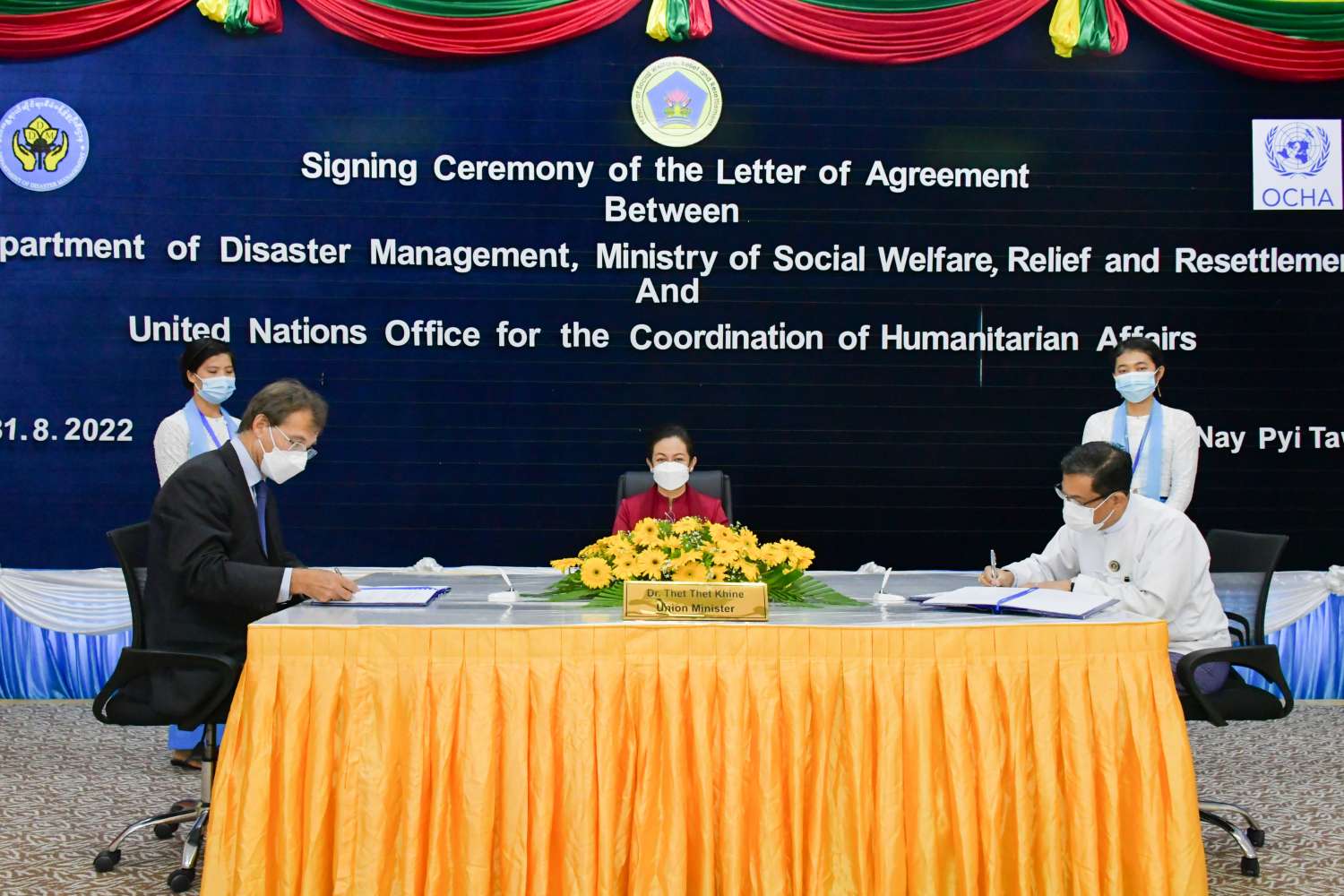 လူမှုဝန်ထမ်း၊ ကယ်ဆယ်ရေးနှင့် ပြန်လည်နေရာချထားရေးဝန်ကြီးဌာန၊ ဘေးအန္တရာယ်ဆိုင်ရာ စီမံခန့်ခွဲမှုဦးစီးဌာနနှင့် United Nations Office for the Coordination of Humanitarian Affairs (UNOCHA) တို့အကြား သဘောတူညီမှုစာလွှာ (Letter of Agreement - LoA) လက်မှတ်ရေးထိုးပွဲ အခမ်းအနားကို ယနေ့နံနက်ပိုင်းတွင် နေပြည်တော်ရှိ ဘေးအန္တရာယ်ဆိုင်ရာ စီမံခန့်ခွဲမှုဦးစီးဌာန အစည်းအဝေးခန်းမ၌ ကျင်းပသည်။