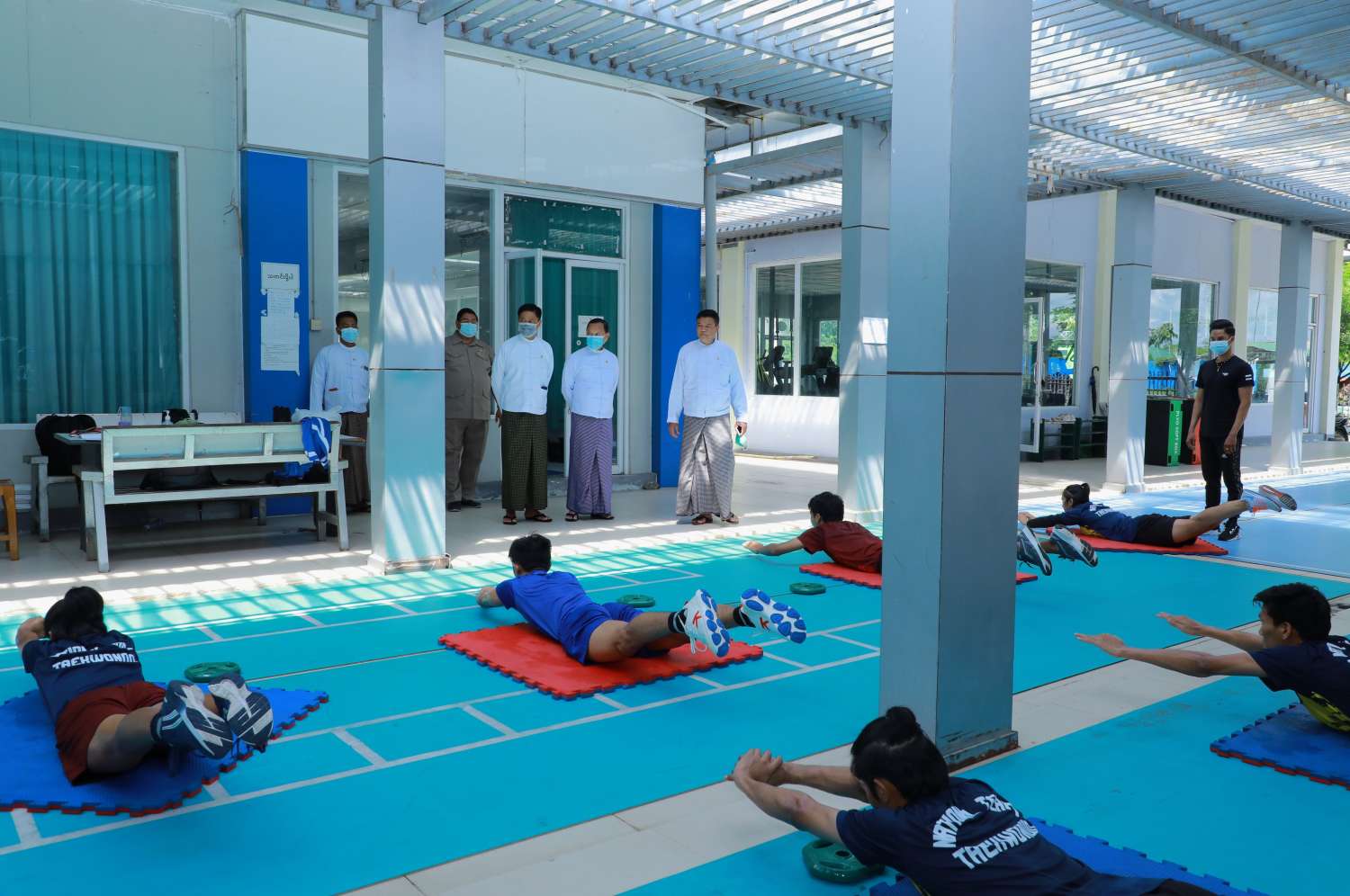ထို့နောက် ပြည်ထောင်စုဝန်ကြီးနှင့် တာဝန်ရှိသူများသည် နေပြည်တော် အားကစားလေ့ကျင့်ရေးစခန်း GYM ခန်းမ၌ လက်ရွေးစင် အားကစားသမားများနှင့်တွေ့ဆုံပြီး ကျန်းမာရေးသည် အရေးကြီးသည့်အတွက် အထူးဂရုစိုက်ကြရန်နှင့် Injury မရရှိအောင် အထူးဂရုစိုက် လေ့ကျင့်ကြရန်လိုကြောင်း၊ နည်းပြများ လေ့ကျင့်သင်ကြားပေးသည့်အတိုင်း စနစ်တကျကြိုးစား လေ့ကျင့်ကြရန်လိုကြောင်း၊ ခန္ဓာကိုယ်ကျန်းမာကြံ့ခိုင်မှ လေ့ကျင့်ထားသည့်အတိုင်း ပြိုင်ပွဲတွင် မိမိတို့၏ အရည်အချင်း၊ အစွမ်းအစများကို ဖော်ထုတ်ပြသနိုင်မည်ဖြစ်ကြောင်း၊ ပြိုင်ပွဲများ ယှဉ်ပြိုင်ရာတွင် နောက်ဆုံးအချိန်အထိ မဆုတ်မနစ် မလျော့သောဇွဲ၊ လုံ့လ၊ စိတ်ဓာတ်တို့ဖြင့် အစွမ်းကုန်ကြိုးစား ယှဉ်ပြိုင်ကြရန်လိုကြောင်း ပြောကြားသည်။