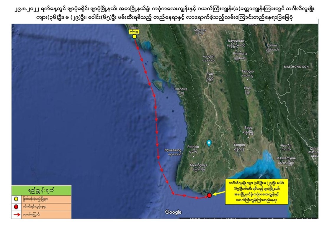 ဖမ်းဆီးရမိသည့် စက်လှေမောင်းဖြစ်သူ ကျော်ဇောလင်းအား စစ်မေးရာ ၎င်းသည် စစ်တွေမြို့နေ ဦးစီမန်(စိစစ်ဆဲ)နှင့် ချိတ်ဆက်ပြီး ယခုသယ်ဆောင်လာသူ ဘင်္ဂါလီလူမျိုး ၆၅ ဦးတို့အား စစ်တွေမြို့မှ ပုသိမ်မြို့၊ ငွေသောင်ယံကမ်းခြေသို့ စက်လှေဖြင့် ပို့ဆောင်ရန် ငွေကျပ် ၂၀၀ သိန်းဖြင့် သဘောတူပြီး စရံငွေစက်လှေ ငှားရမ်းခ ၂၅ သိန်းအား ဦးစီမန်မှ ပေးခဲ့ကြောင်း၊ ဩဂုတ်လ ၂၂ ရက်နေ့ မွန်းလွဲ ၁ နာရီအချိန်တွင် စစ်တွေမြို့မဈေးဆိပ်ကမ်း၌ ဘင်္ဂါလီလူမျိုး ၆၅ ဦးတို့အား သယ်ဆောင်ကာ စစ်တွေမှ ပင်လယ်ပြင်အတိုင်း ကျောက်ဖြူ-မန်အောင်-ငပလီ-သံတွဲတို့ကို ဖြတ်သန်းမောင်းနှင်ပြီး ရွှေသောင်ယံအနီး ပင်လယ်ပြင်တွင် ကျောက်ချရပ်နားခဲ့ကြောင်း၊ ဩဂုတ်လ ၂၅ ရက်နေ့ မွန်းလွဲ ၂ နာရီအချိန်တွင် ဦးစီမန်မှ ဖုန်းဆက်ကာ ရွှေသောင်ယံတွင် ကမ်းကပ်၍မရကြောင်း GPS ဖြင့် ပွိုင့် ၇ ပွိုင့်ပေးပြီး မောင်းနှင်ခိုင်းသဖြင့် မောင်းနှင်ခဲ့ရာ ဩဂုတ်လ ၂၆ ရက်နေ့ ည ၁၀ နာရီအချိန်တွင် ကဒုံကနိကျွန်းသာယာအနီး ပင်လယ်ပြင်တွင် ကျောက်ချရပ်နားပြီး ဦးစီမန် စေလွှတ်သည့်အဖွဲ့အား စောင့်ဆိုင်းနေစဉ် လုံခြုံရေးတပ်ဖွဲ့ဝင်များ၏ ဖမ်းဆီးထိန်းသိမ်းခံခဲ့ရခြင်းဖြစ်ကြောင်း သိရှိရသည်။