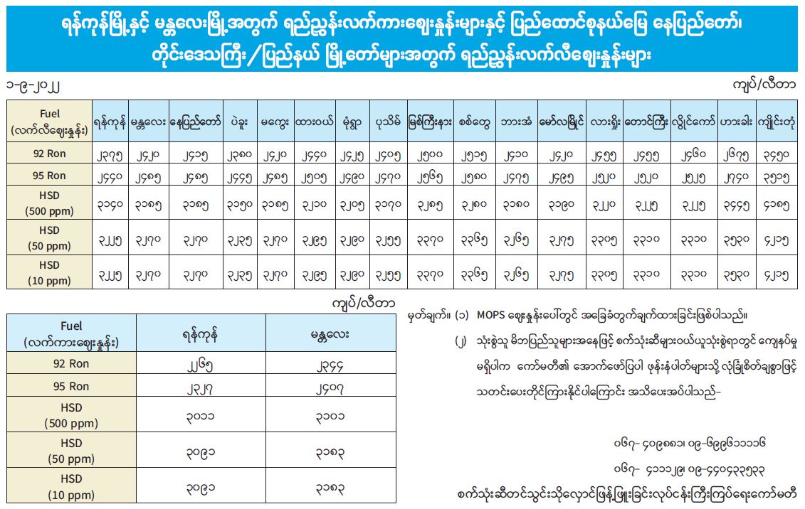 ရန်ကုန်မြို့နှင့် မန္တလေးမြို့အတွက် ရည်ညွှန်းလက်ကားဈေးနှုန်းများနှင့် ပြည်ထောင်စုနယ်မြေ နေပြည်တော်၊ တိုင်းဒေသကြီး/ ပြည်နယ် မြို့တော်များအတွက် ရည်ညွှန်းလက်လီဈေးနှုန်းများ 09/01/2022