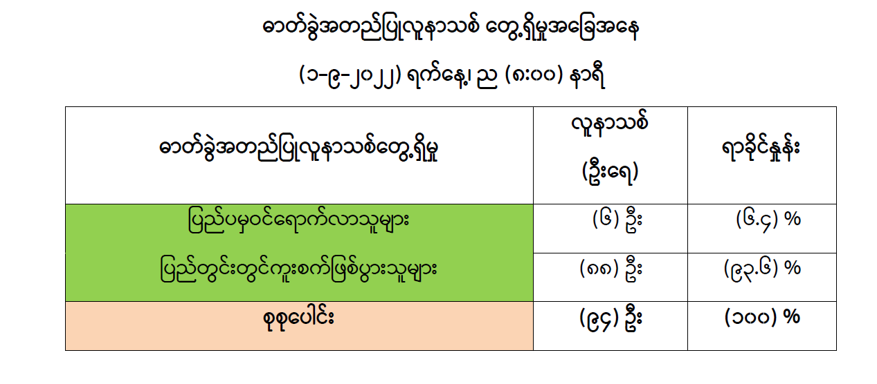 COVID-19 သံသယလူနာများ၊ ဓာတ်ခွဲအတည်ပြုလူနာနှင့် အနီးကပ်ထိတွေ့ခဲ့သူများနှင့် အသွားအလာ ကန့်သတ်ထားရှိသူများအား COVID-19 ရောဂါ ရှိ၊ မရှိ ဓာတ်ခွဲစစ်ဆေးခြင်း ပုံမှန်ဆောင်ရွက်လျက်ရှိပြီး (၃၁-၈-၂၀၂၂) ရက်နေ့၊ ည (၈:၀၀) နာရီမှ (၁-၉-၂၀၂၂) ရက်နေ့၊ ည (၈:၀၀) နာရီအတွင်း ဓာတ်ခွဲနမူနာစုစုပေါင်း (၈,၄၃၉) ခုအား စစ်ဆေးပြီးစီးခဲ့ရာ COVID-19 ရောဂါ ဓာတ်ခွဲအတည်ပြုလူနာသစ် (၉၄) ဦး တွေ့ရှိရပါသည်။ ထို့ကြောင့် ယနေ့အတွက် ရောဂါပိုးတွေ့ရှိမှု ရာခိုင်နှုန်းမှာ (၁.၁၁) ရာခိုင်နှုန်း ရှိပါသည်။ ယနေ့တွေ့ရှိသော COVID-19 ရောဂါ ဓာတ်ခွဲအတည်ပြုလူနာသစ် (၉၄) ဦးအနက် (၆) ဦး၊ (၆.၄) ရာခိုင်နှုန်းမှာ ပြည်ပမှဝင်ရောက်လာသူများအား ဓာတ်ခွဲစစ်ဆေးရာမှ တွေ့ရှိခြင်းဖြစ်ပြီး (၈၈) ဦး၊ (၉၃.၆) ရာခိုင်နှုန်းမှာ ပြည်တွင်းတွင် ကူးစက်ဖြစ်ပွားသူများ ဖြစ်ပါသည်။