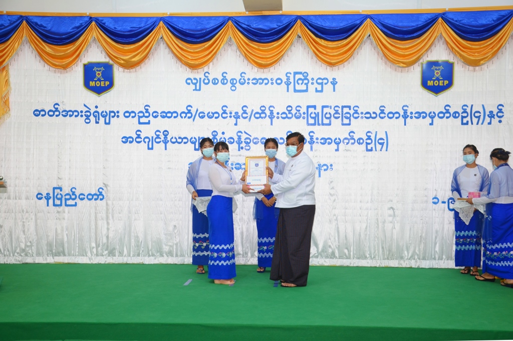 ထို့နောက် ပြည်ထောင်စုဝန်ကြီးက ဓာတ်အားခွဲရုံများ တည်ဆောက်/ မောင်းနှင်/ ထိန်းသိမ်းပြုပြင်ခြင်းသင်တန်းမှ ထူးချွန်ဆုရရှိသူများကို လည်းကောင်း၊ ဒုတိယဝန်ကြီး ဒေါက်တာအောင်ဇေယျက အင်ဂျင်နီယာများ စီမံခန့်ခွဲရေးသင်တန်းမှ ထူးချွန်ဆု ရရှိသူများကိုလည်းကောင်း ဆုများပေးအပ်ချီးမြှင့်ခဲ့ပြီး ညွန်ကြားရေးမှူးချုပ်နှင့် ဦးဆောင်ညွှန်ကြားရေးမှူးတို့က သင်တန်းဆင်းလက်မှတ်များကို သင်တန်းသားများထံ ပေးအပ်ခဲ့ကြောင်း သိရသည်။