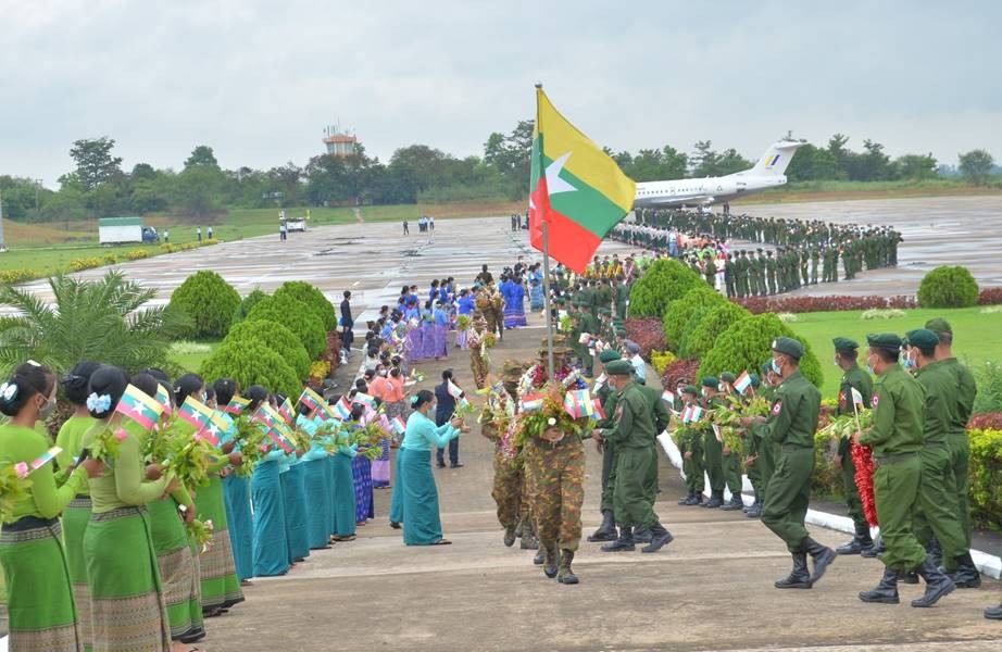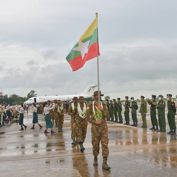 ရုရှားဖက်ဒရေးရှင်းနိုင်ငံ၊ မော်စကိုမြို့တွင် ကျင်းပပြုလုပ်သည့် International Army Games-2022 ပြိုင်ပွဲသို့ ဝင်ရောက်ယှဉ်ပြိုင်ခဲ့ကြသော မြန်မာ့တပ်မတော် ကိုယ်စားလှယ် အဖွဲ့သည် ယနေ့နံနက်ပိုင်းတွင် နေပြည်တော်သို့ ပြန်လည်ရောက်ရှိလာရာ ညှိနှိုင်းကွပ်ကဲ ရေးမှူး(ကြည်း၊ရေ၊လေ) ဗိုလ်ချုပ်ကြီး မောင်မောင်အေး၊ စစ်ရေးချုပ် ဒုတိယဗိုလ်ချုပ်ကြီး မျိုးဇော်သိန်း၊ ကာကွယ်ရေးဦးစီးချုပ်ရုံး(ကြည်း)မှ တပ်မတော်အရာရှိကြီးများ၊ နေပြည်တော် တိုင်းစစ်ဌာနချုပ် တိုင်းမှူးဗိုလ်ချုပ်ဇော်ဟိန်းနှင့် တာဝန်ရှိသူများ၊ အရာရှိ/စစ်သည်၊ မိသားစုများက လေဆိပ်တွင် သောင်းသောင်းဖျဖျ ကြိုဆိုကြသည်။