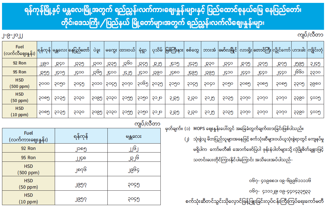 ရန်ကုန်မြို့နှင့် မန္တလေးမြို့အတွက် ရည်ညွှန်းလက်ကား ဈေးနှုန်းများနှင့် ပြည်ထောင်စုနယ်မြေ နေပြည်တော်၊ တိုင်းဒေသကြီး/ ပြည်နယ် မြို့တော်များအတွက် ရည်ညွှန်းလက်လီဈေးနှုန်းများ 09/02/2022