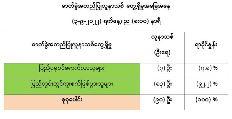 COVID-19 သံသယလူနာများ၊ ဓာတ်ခွဲအတည်ပြုလူနာနှင့် အနီးကပ်ထိတွေ့ခဲ့သူများနှင့် အသွားအလာကန့်သတ်ထားရှိသူများအား COVID-19 ရောဂါ ရှိ၊ မရှိ ဓာတ်ခွဲစစ်ဆေးခြင်း ပုံမှန် ဆောင်ရွက်လျက်ရှိပြီး (၂-၉-၂၀၂၂) ရက်နေ့၊ ည (၈:၀၀) နာရီမှ (၃-၉-၂၀၂၂) ရက်နေ့၊ ည (၈:၀၀) နာရီအတွင်း ဓာတ်ခွဲနမူနာစုစုပေါင်း (၈,၃၂၃) ခုအား စစ်ဆေးပြီးစီးခဲ့ရာ COVID-19 ရောဂါ ဓာတ်ခွဲအတည်ပြုလူနာသစ် (၉၀) ဦး တွေ့ရှိရပါသည်။ ထို့ကြောင့် ယနေ့အတွက် ရောဂါပိုးတွေ့ရှိမှု ရာခိုင်နှုန်းမှာ (၁.၀၈) ရာခိုင်နှုန်း ရှိပါသည်။ ယနေ့တွေ့ရှိသော COVID-19 ရောဂါ ဓာတ်ခွဲအတည်ပြု လူနာသစ် (၉၀) ဦးအနက် (၇) ဦး၊ (၇.၈) ရာခိုင်နှုန်းမှာ ပြည်ပမှဝင်ရောက်လာသူများအား ဓာတ်ခွဲစစ်ဆေးရာမှ တွေ့ရှိခြင်းဖြစ်ပြီး (၈၃) ဦး၊ (၉၂.၂) ရာခိုင်နှုန်းမှာ ပြည်တွင်းတွင် ကူးစက်ဖြစ်ပွားသူ များဖြစ်ပါသည်။