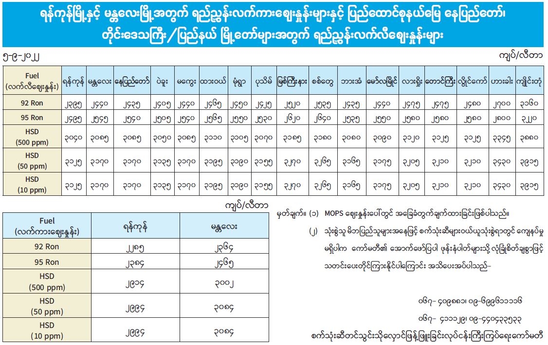ရန်ကုန်မြို့နှင့် မန္တလေးမြို့အတွက် ရည်ညွှန်းလက်ကားဈေးနှုန်းများနှင့် ပြည်ထောင်စုနယ်မြေ နေပြည်တော်၊ တိုင်းဒေသကြီး/ပြည်နယ် မြို့တော်များအတွက် ရည်ညွှန်းလက်လီဈေးနှုန်းများ 09/05/2022