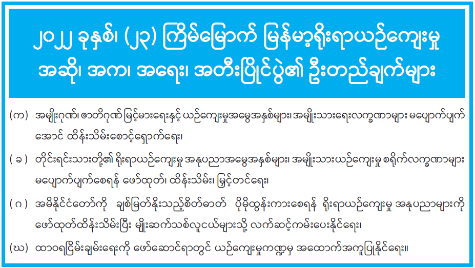 ၂၀၂၂ ခုနှစ်၊ (၂၃)ကြိမ်မြောက် မြန်မာ့ရိုးရာယဉ်ကျေးမှု အဆို၊ အက၊ အရေး၊ အတီး ပြိုင်ပွဲ၏ ဦးတည်ချက်များ 09/07/2022
