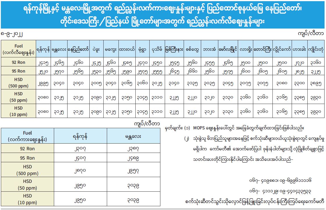 ရန်ကုန်မြို့နှင့် မန္တလေးမြို့အတွက် ရည်ညွှန်းလက်ကားဈေးနှုန်းများနှင့် ပြည်ထောင်စုနယ်မြေ နေပြည်တော်၊ တိုင်းဒေသကြီး/ ပြည်နယ် မြို့တော်များအတွက် ရည်ညွှန်းလက်လီဈေးနှုန်းများ