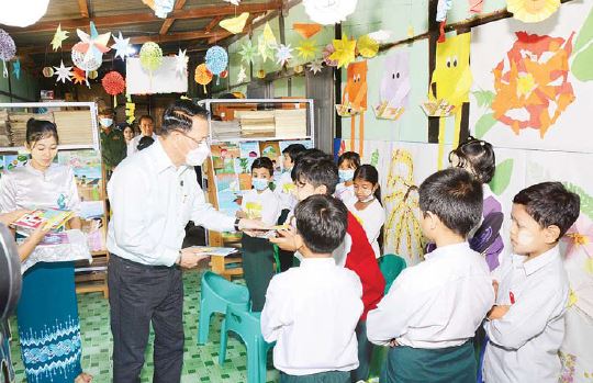 ထို့နောက်ပြင်ဦးလွင်မြို့ရှိ ခရိုင်စာကြည့်တိုက်ကိုကြည့်ရှု စစ်ဆေးပြီးကလေးစာဖတ်ခန်းအတွင်း စာပေလေ့လာဖတ်ရှုနေ ကြသောကလေးငယ်များအား ပြည်ထောင်စု ဝန်ကြီးနှင့် ဇနီးတို့က လက်ဆောင်ပစ္စည်းများ ပေးအပ်ကာ ခရိုင်နှင့်မြို့နယ် ပြန်/ဆက်ရုံး ဝန်ထမ်းများ အတွက် ထောက်ပံ့ငွေများ ပေးအပ်သည်။