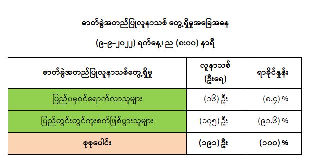 COVID-19 သံသယလူနာများ၊ ဓာတ်ခွဲအတည်ပြုလူနာနှင့် အနီးကပ်ထိတွေ့ခဲ့သူများနှင့် အသွားအလာကန့်သတ်ထားရှိသူများအား COVID-19 ရောဂါ ရှိ၊ မရှိ ဓာတ်ခွဲစစ်ဆေးခြင်း ပုံမှန် ဆောင်ရွက်လျက်ရှိပြီး (၈-၉-၂၀၂၂) ရက်နေ့၊ ည (၈:၀၀) နာရီမှ (၉-၉-၂၀၂၂) ရက်နေ့၊ ည (၈:၀၀) နာရီအတွင်း ဓာတ်ခွဲနမူနာ စုစုပေါင်း (၉,၈၄၆) ခုအား စစ်ဆေးပြီးစီးခဲ့ရာ COVID-19 ရောဂါ ဓာတ်ခွဲအတည်ပြုလူနာသစ် (၁၉၁) ဦး တွေ့ရှိရပါသည်။ ထို့ကြောင့် ယနေ့အတွက် ရောဂါပိုးတွေ့ရှိမှု ရာခိုင်နှုန်းမှာ (၁.၉၄) ရာခိုင်နှုန်း ရှိပါသည်။ ယနေ့တွေ့ရှိသော COVID-19 ရောဂါ ဓာတ်ခွဲအတည်ပြုလူနာသစ် (၁၉၁) ဦးအနက် (၁၆) ဦး၊ (၈.၄) ရာခိုင်နှုန်းမှာ ပြည်ပမှဝင်ရောက်လာသူများအား ဓာတ်ခွဲစစ်ဆေးရာမှ တွေ့ရှိခြင်းဖြစ်ပြီး (၁၇၅) ဦး၊ (၉၁.၆) ရာခိုင်နှုန်းမှာ ပြည်တွင်းတွင် ကူးစက်ဖြစ်ပွားသူများ ဖြစ်ပါသည်။