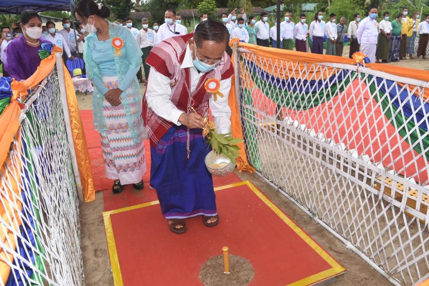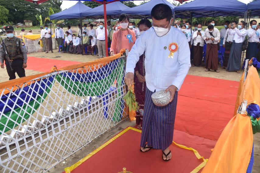 ဦးစွာနိုင်ငံတော်စီမံအုပ်ချုပ်ရေးကောင်စီအဖွဲ့ဝင် မန်းငြိမ်းမောင်၊ တိုင်းဒေသကြီးဝန်ကြီးချုပ် ဦးတင်မောင်ဝင်း၊ အနောက်တောင်တိုင်းစစ်ဌာနချုပ်တိုင်းမှူး ဗိုလ်ချုပ်အောင်အောင်၊ တိုင်းဒေသကြီးအစိုးရအဖွဲ့ဝင်များနှင့် တာဝန်ရှိသူများသည် မင်္ဂလာအချိန်တွင် သတ်မှတ်နေရာများ၌ မင်္ဂလာပန္နက်တိုင်များစိုက်ထူ၍ အမွှေးနံ့သာရည်များ ပက်ဖြန်းပေးကြပြီး လူထုအခြေပြုဗဟိုဌာန (Community Centre) ဆောက်လုပ်ရေး ကုမ္ပဏီတာဝန်ခံက လုပ်ငန်းဆောင်ရွက်မှုကို ရှင်းလင်းတင်ပြသည်။