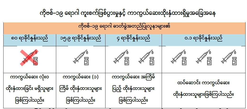 သို့ဖြစ်ပါ၍ မြန်မာနိုင်ငံတွင် ကိုဗစ်-၁၉ ရောဂါ ကာကွယ်ဆေးထိုးနှံမှုနှင့် ကိုဗစ်-၁၉ ရောဂါ ကူးစက်ဖြစ်ပွား/ သေဆုံးမှုတို့ကို လေ့လာသုံးသပ်ချက်အရ ကာကွယ်ဆေးထိုးနှံထားသူများတွင် ကိုဗစ်-၁၉ ရောဂါ ဖြစ်ပွားမှုနှင့် သေဆုံးမှုကို လျှော့ချနိုင်ပြီး ထပ်ဆောင်းကာကွယ်ဆေး ထိုးနှံခြင်း ဖြင့်လည်း ရောဂါဖြစ်ပွားမှုနှင့် သေဆုံးမှုကို လျှော့ချနိုင်ကြောင်းကို တွေ့ရှိရသည်ဖြစ်ရာ မိဘပြည်သူ များအနေဖြင့် ကိုဗစ်-၁၉ ရောဂါ ကာကွယ်ရေးစည်းမျဉ်းစည်းကမ်းများကို တိကျစွာ လိုက်နာခြင်း၊ ပါးစပ်နှင့်နှာခေါင်းစည်း (Mask) ကို စနစ်တကျတပ်ဆင်ခြင်းနှင့် နီးစပ်ရာ ကျန်းမာရေးဌာနများ၊ ကျေးရွာ/ရပ်ကွက် အုပ်ချုပ်ရေးမှူးရုံးများနှင့်ဆက်သွယ်၍ ကိုဗစ်-၁၉ ရောဂါ ကာကွယ်ဆေး ထိုးနှံမှု နှင့် ထပ်ဆောင်းကာကွယ်ဆေးများ ထိုးနှံခြင်းတို့ကို မပျက်မကွက် ဆောင်ရွက်ကြပါရန် အသိပေး နှိုးဆော်အပ်ပါသည်။