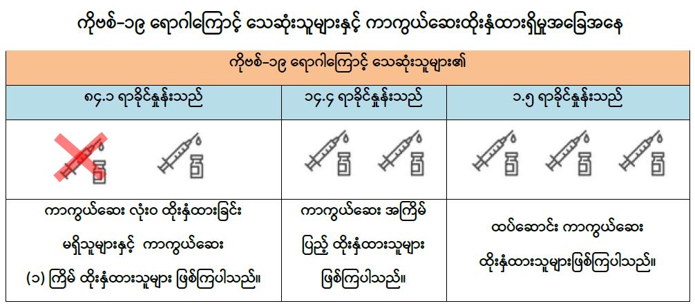မြန်မာနိုင်ငံတွင် (၂၈-၁-၂၀၂၂) ရက်နေ့မှ (၇-၉-၂၀၂၂) ရက်နေ့အထိ တွေ့ရှိရသော ကိုဗစ်-၁၉ ရောဂါကြောင့် သေဆုံးသူများ၏ ကိုဗစ်-၁၉ ရောဂါ ကာကွယ် ဆေးထိုးနှံထားရှိမှု အခြေအနေများ ကို ဆန်းစစ်ချက်အရ ကိုဗစ်-၁၉ ရောဂါဖြစ်ပွားသူများ၏ (၈၄.၁) ရာခိုင်နှုန်းမှာ ကာကွယ်ဆေးလုံးဝ ထိုးနှံထားခြင်း မရှိသူများနှင့် ကာကွယ်ဆေး အကြိမ်ပြည့်ထိုးနှံထားခြင်းမရှိသူများ ဖြစ်ကြပြီး (၁၄.၄) ရာခိုင်နှုန်းမှာ ကာကွယ်ဆေး အကြိမ်ပြည့်ထိုးနှံထားရှိသူများဖြစ်ကာ (၁.၅) ရာခိုင်နှုန်းမှာ ထပ်ဆောင်းကာကွယ်ဆေး ထိုးနှံထားသူများဖြစ်ကြောင်း တွေ့ရှိရပါသည်။