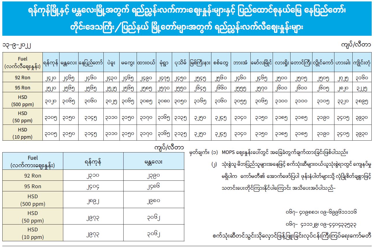ရန်ကုန်မြို့နှင့် မန္တလေးမြို့အတွက် ရည်ညွှန်းလက်ကားဈေးနှုန်းများနှင့် ပြည်ထောင်စုနယ်မြေ နေပြည်တော်၊ တိုင်းဒေသကြီး/ပြည်နယ် မြို့တော်များအတွက် ရည်ညွှန်းလက်လီဈေးနှုန်းများ 09/13/2022