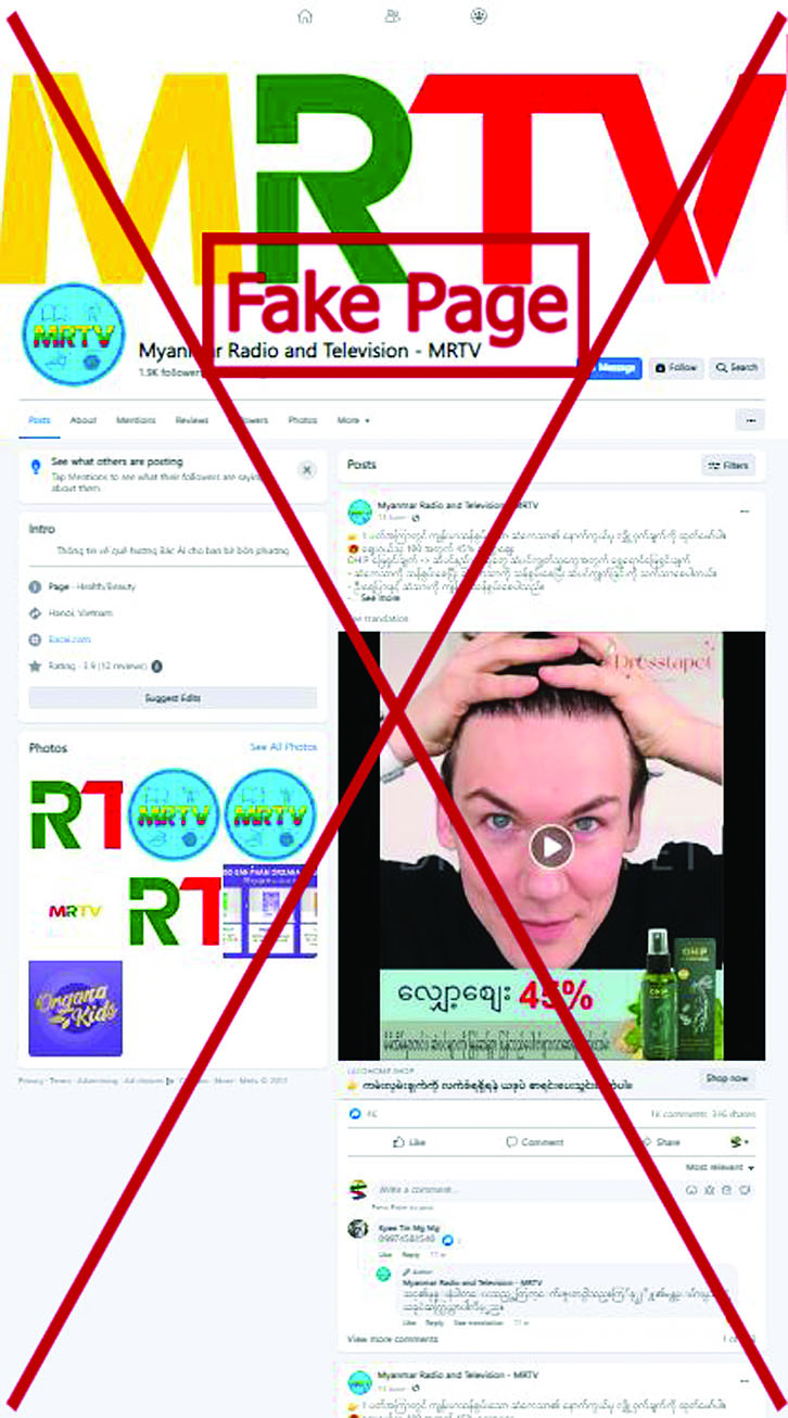 “ပြန်ကြားရေးဝန်ကြီးဌာန၊ မြန်မာ့အသံနှင့် ရုပ်မြင်သံကြားက အများ ပြည်သူအတွက် ထုတ်လွှင့် ဝန်ဆောင်မှုပေးလျက်ရှိသည့် MRTV HD နှင့် ဆက်စပ်ရုပ်သံလိုင်းများ၏ ရုပ်သံအစီအစဉ်များကို MRTV Media Application တွင် အကြောင်းအရာအလိုက် ကဏ္ဍခွဲ ၁၁ ခုဖြင့် ထုတ်လွှင့်ဖော်ပြလျက်ရှိရာ အဆိုပါ MRTV Media Application ၏ Logo ကို profile ပုံအဖြစ်လည်းကောင်း၊ MRTV ၏ logo အဟောင်းကို Cover photo အဖြစ်လည်းကောင်း ရယူတုပအသုံးပြု၍ “Myanmar Radio and Television” အမည် Facebook Page ဖြင့် ညစ်ညမ်းပစ္စည်းများရောင်းချနေမှုကို စိစစ်တွေ့ရှိရပါသည်။