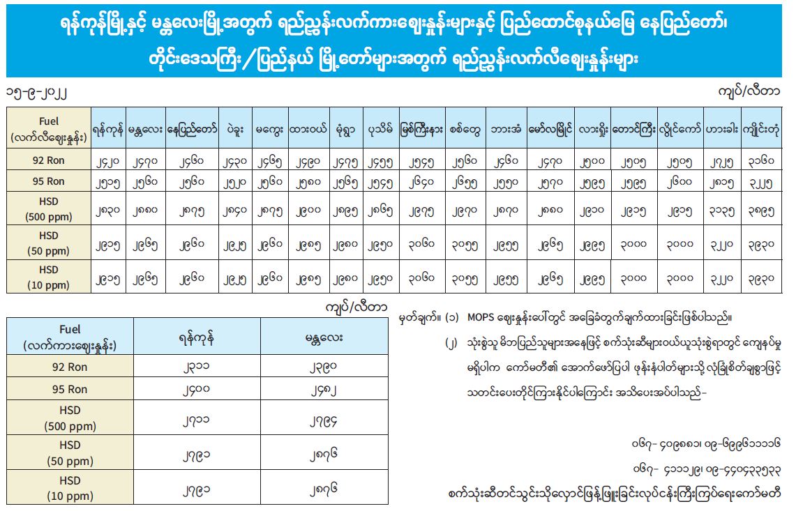 ရန်ကုန်မြို့နှင့် မန္တလေးမြို့တို့အတွက် ရည်ညွှန်းလက်ကားစျေးနှုန်းများနှင့် ပြည်ထောင်စုနယ်မြေ နေပြည်တော်၊ တိုင်းဒေသကြီး/ပြည်နယ် မြို့တော်များအတွက် ရည်ညွှန်းလက်လီစျေးနှုန်းများ 09/15/2022