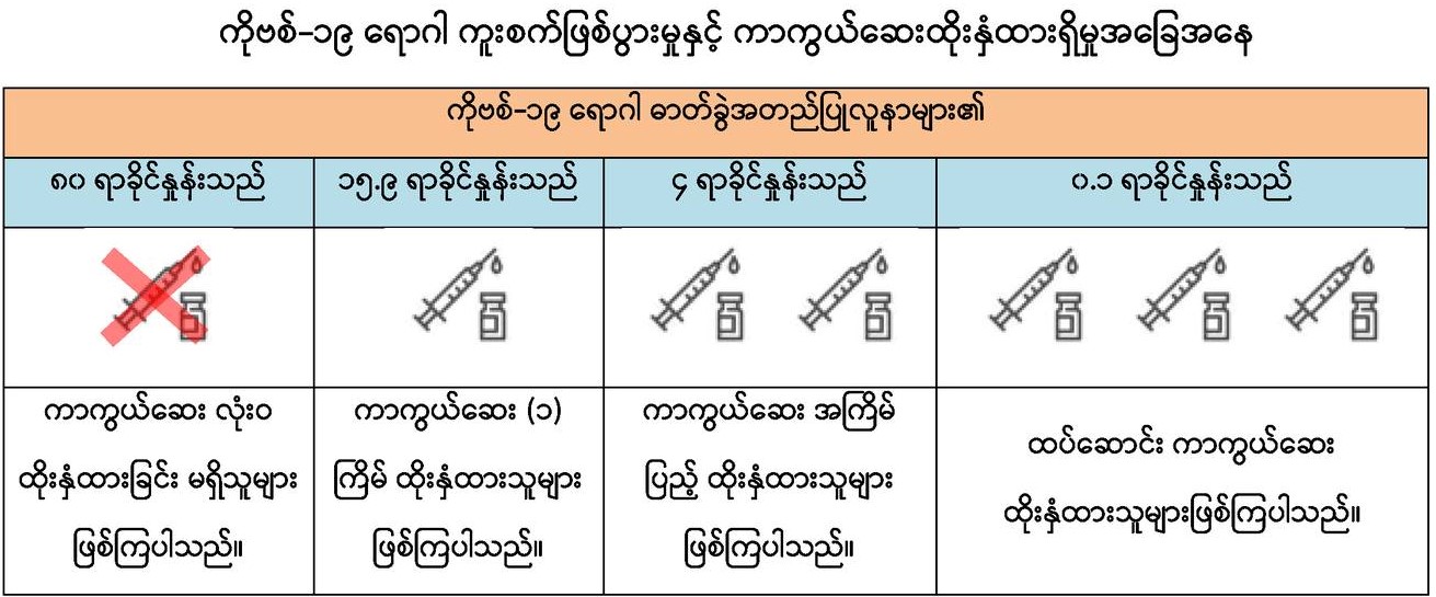 သို့ဖြစ်ပါ၍ မြန်မာနိုင်ငံတွင် ကိုဗစ်-၁၉ ရောဂါ ကာကွယ်ဆေးထိုးနှံမှုနှင့် ကိုဗစ်-၁၉ ရောဂါ ကူးစက်ဖြစ်ပွား သေဆုံးမှုတို့ကို လေ့လာသုံးသပ်ချက်အရ ကာကွယ်ဆေးထိုးနှံထားသူများတွင် ကိုဗစ်-၁၉ ရောဂါ ဖြစ်ပွားမှုနှင့် သေဆုံးမှုကို လျှော့ချနိုင်ပြီး ထပ်ဆောင်းကာကွယ်ဆေး ထိုးနှံခြင်း ဖြင့်လည်း ရောဂါဖြစ်ပွားမှုနှင့် သေဆုံးမှုကို လျှော့ချနိုင်ကြောင်းကို တွေ့ရှိရသည်ဖြစ်ရာ မိဘပြည်သူ များအနေဖြင့် ကိုဗစ်-၁၉ ရောဂါ ကာကွယ်ရေးစည်းမျဉ်းစည်းကမ်းများကို တိကျစွာ လိုက်နာခြင်း၊ ပါးစပ်နှင့်နှာခေါင်းစည်း (Mask) ကို စနစ်တကျတပ်ဆင်ခြင်းနှင့် နီးစပ်ရာ ကျန်းမာရေးဌာနများ၊ ကျေးရွာ/ရပ်ကွက် အုပ်ချုပ်ရေးမှူးရုံးများနှင့်ဆက်သွယ်၍ ကိုဗစ်-၁၉ ရောဂါ ကာကွယ်ဆေး ထိုးနှံမှု နှင့် ထပ်ဆောင်းကာကွယ်ဆေးများ ထိုးနှံခြင်းတို့ကို မပျက်မကွက် ဆောင်ရွက်ကြပါရန် အသိပေး အပ်ပါသည်။