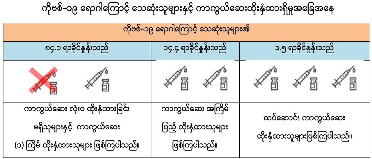 မြန်မာနိုင်ငံတွင် (၂၈-၁-၂၀၂၂) ရက်နေ့မှ (၇-၉-၂၀၂၂) ရက်နေ့အထိ တွေ့ရှိရသော ကိုဗစ်-၁၉ ရောဂါကြောင့် သေဆုံးသူများ၏ ကိုဗစ်-၁၉ ရောဂါ ကာကွယ် ဆေးထိုးနှံထားရှိမှု အခြေအနေများကို ဆန်းစစ်ချက်အရ ကိုဗစ်-၁၉ ရောဂါဖြစ်ပွားသူများ၏ (၈၄.၁) ရာခိုင်နှုန်းမှာ ကာကွယ်ဆေးလုံးဝ ထိုးနှံထားခြင်း မရှိသူများနှင့် ကာကွယ်ဆေး အကြိမ်ပြည့်ထိုးနှံထားခြင်းမရှိသူများ ဖြစ်ကြပြီး (၁၄.၄) ရာခိုင်နှုန်းမှာ ကာကွယ်ဆေး အကြိမ်ပြည့်ထိုးနှံထားရှိသူများဖြစ်ကာ (၁.၅) ရာခိုင်နှုန်းမှာ ထပ်ဆောင်းကာကွယ်ဆေး ထိုးနှံထားသူများဖြစ်ကြောင်း တွေ့ရှိရပါသည်။