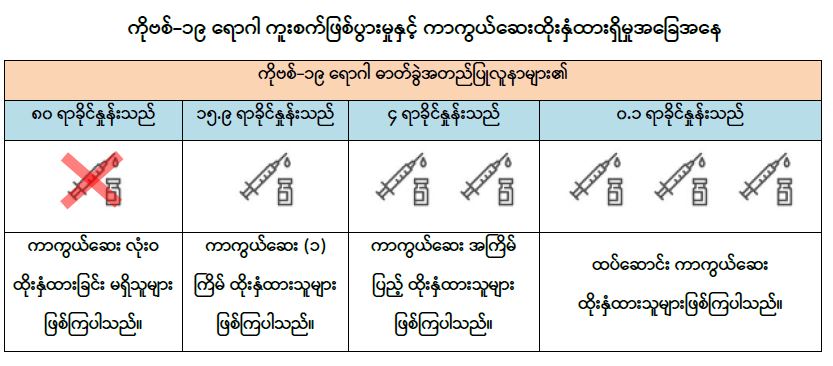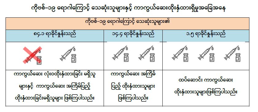 သို့ဖြစ်ပါ၍ မြန်မာနိုင်ငံတွင် ကိုဗစ်-၁၉ ရောဂါ ကာကွယ်ဆေးထိုးနှံမှုနှင့် ကိုဗစ်-၁၉ ရောဂါ ကူးစက်ဖြစ်ပွား/ သေဆုံးမှုတို့ကို လေ့လာသုံးသပ်ချက်အရ ကာကွယ်ဆေးထိုးနှံထားသူ များတွင် ကိုဗစ်-၁၉ ရောဂါ ဖြစ်ပွားမှုနှင့် သေဆုံးမှုကို လျှော့ချနိုင်ပြီး ထပ်ဆောင်း ကာကွယ်ဆေး ထိုးနှံခြင်းဖြင့်လည်း ရောဂါဖြစ်ပွားမှုနှင့် သေဆုံးမှုကို လျှော့ချနိုင်ကြောင်းကို တွေ့ရှိရသည်ဖြစ်ရာ မိဘပြည်သူများအနေဖြင့် ကိုဗစ်-၁၉ ရောဂါ ကာကွယ်ရေးစည်းမျဉ်း စည်းကမ်းများကို တိကျစွာလိုက်နာခြင်း၊ ပါးစပ်နှင့်နှာခေါင်းစည်း (Mask) ကို စနစ်တကျ တပ်ဆင်ခြင်းနှင့် နီးစပ်ရာ ကျန်းမာရေးဌာနများ၊ ကျေးရွာ/ရပ်ကွက် အုပ်ချုပ်ရေးမှူး ရုံးများနှင့် ဆက်သွယ်၍ ကိုဗစ်-၁၉ ရောဂါ ကာကွယ်ဆေးထိုးနှံမှုနှင့် ထပ်ဆောင်း ကာကွယ်ဆေးများ ထိုးနှံခြင်းတို့ကို မပျက်မကွက် ဆောင်ရွက်ကြပါရန် အသိပေး နှိုးဆော် အပ်ပါသည်။