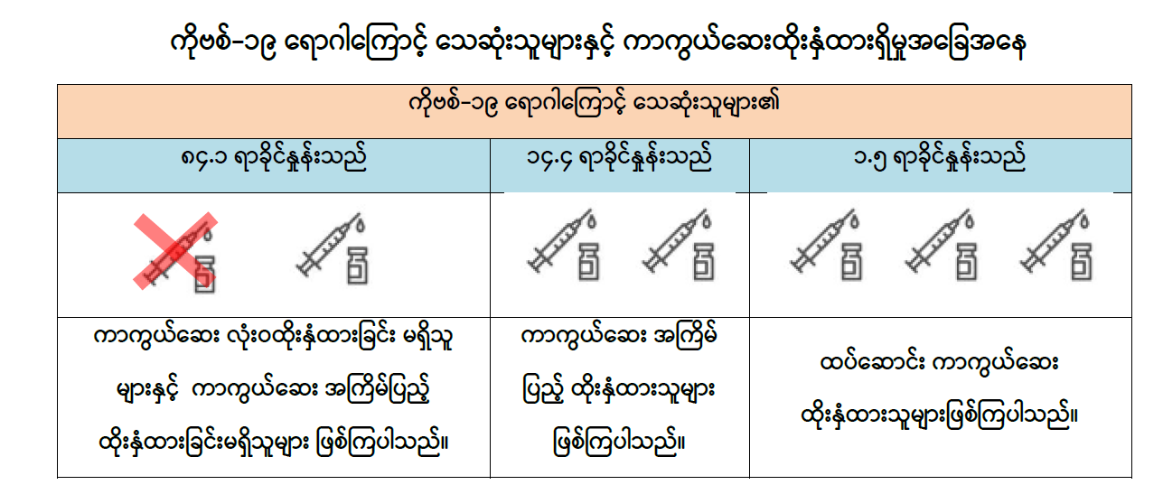 မြန်မာနိုင်ငံတွင် (၂၈-၁-၂၀၂၂) ရက်နေ့မှ (၇-၉-၂၀၂၂) ရက်နေ့အထိ တွေ့ရှိရသော ကိုဗစ်-၁၉ ရောဂါကြောင့် သေဆုံးသူများ၏ ကိုဗစ်-၁၉ ရောဂါ ကာကွယ်ဆေးထိုးနှံထားရှိမှု အခြေအနေများကို ဆန်းစစ်ချက်အရ ကိုဗစ်-၁၉ ရောဂါဖြစ်ပွားသူများ၏ (၈၄.၁) ရာခိုင်နှုန်းမှာ ကာကွယ်ဆေး လုံးဝထိုးနှံထားခြင်း မရှိသူများနှင့် ကာကွယ်ဆေးအကြိမ်ပြည့် ထိုးနှံထားခြင်းမရှိသူများဖြစ်ကြပြီး (၁၄.၄) ရာခိုင်နှုန်းမှာ ကာကွယ်ဆေးအကြိမ်ပြည့် ထိုးနှံထားရှိသူများဖြစ်ကာ (၁.၅) ရာခိုင်နှုန်းမှာ ထပ်ဆောင်းကာကွယ်ဆေး ထိုးနှံထားသူများဖြစ်ကြောင်း တွေ့ရှိရပါသည်။ သို့ဖြစ်ပါ၍ မြန်မာနိုင်ငံတွင် ကိုဗစ်-၁၉ ရောဂါ ကာကွယ်ဆေးထိုးနှံမှုနှင့် ကိုဗစ်-၁၉ ရောဂါ ကူးစက်ဖြစ်ပွား/ သေဆုံးမှုတို့ကို လေ့လာသုံးသပ်ချက်အရ ကာကွယ်ဆေးထိုးနှံထားသူများတွင် ကိုဗစ်-၁၉ ရောဂါ ဖြစ်ပွားမှုနှင့် သေဆုံးမှုကို လျှော့ချနိုင်ပြီး ထပ်ဆောင်းကာကွယ်ဆေး ထိုးနှံခြင်းဖြင့်လည်း ရောဂါဖြစ်ပွားမှုနှင့် သေဆုံးမှုကို လျှော့ချနိုင်ကြောင်းကို တွေ့ရှိရသည်ဖြစ်ရာ မိဘပြည်သူများအနေဖြင့် ကိုဗစ်-၁၉ ရောဂါကာကွယ်ရေး စည်းမျဉ်း စည်းကမ်းများကို တိကျစွာလိုက်နာခြင်း၊ ပါးစပ်နှင့်နှာခေါင်းစည်း (Mask)ကို စနစ်တကျ တပ်ဆင်ခြင်းနှင့် နီးစပ်ရာ ကျန်းမာရေးဌာနများ၊ ကျေးရွာ/ရပ်ကွက် အုပ်ချုပ်ရေးမှူးရုံးများနှင့် ဆက်သွယ်၍ ကိုဗစ်-၁၉ ရောဂါကာကွယ်ဆေး ထိုးနှံမှုနှင့် ထပ်ဆောင်းကာကွယ်ဆေးများ ထိုးနှံခြင်းတို့ကို မပျက်မကွက် ဆောင်ရွက်ကြပါရန် အသိပေး နှိုးဆော်အပ်ပါသည်။