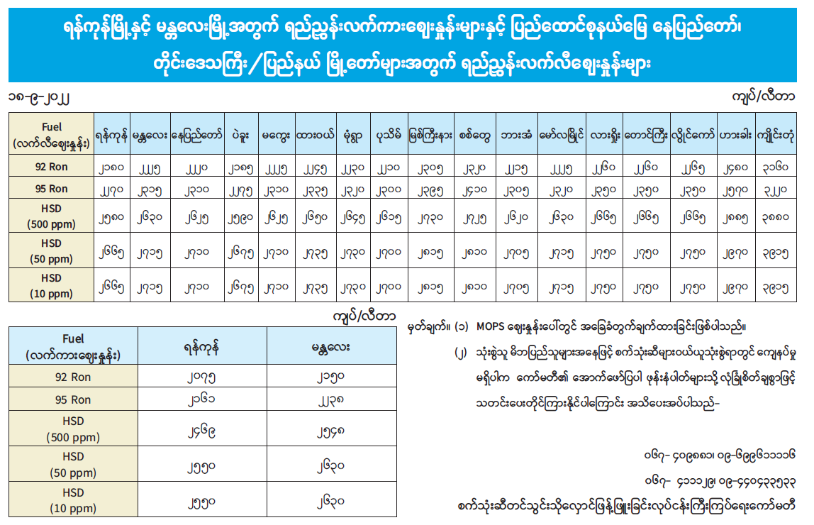 ရန်ကုန်မြို့နှင့် မန္တလေးမြို့အတွက် ရည်ညွှန်းလက်ကား ဈေးနှုန်းများနှင့် ပြည်ထောင်စုနယ်မြေ နေပြည်တော်၊ တိုင်းဒေသကြီး/ပြည်နယ် မြို့တော်များအတွက် ရည်ညွှန်းလက်လီဈေးနှုန်းများ 09/18/2022