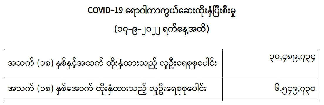 COVID-19 ရောဂါ ကာကွယ်ထိန်းချုပ်ရေးအတွက် တိုင်းဒေသကြီး/ ပြည်နယ်များတွင် COVID-19 ရောဂါကာကွယ်ဆေးကို ဦးတည်အုပ်စုများသတ်မှတ်၍ ထိုးနှံပေးလျက်ရှိရာ (၁၇-၉-၂၀၂၂) ရက်နေ့ အထိ အသက် (၁၈) နှစ်နှင့်အထက် လူဦးရေစုစုပေါင်း (၃၀,၄၈၉,၇၃၄) ဦးနှင့် အသက် (၁၈) နှစ် အောက် လူဦးရေစုစုပေါင်း (၆,၅၄၉,၇၃၀) ဦး တို့အား ထိုးနှံထားရှိပြီး ဖြစ်ပါသည်။