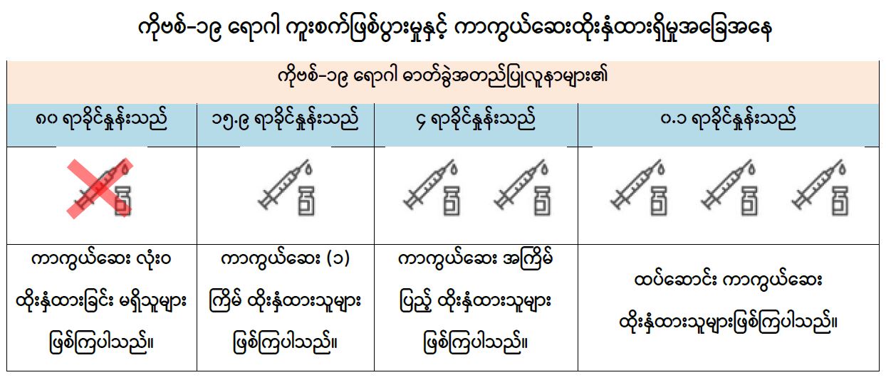 မြန်မာနိုင်ငံတွင် (၂၈-၁-၂၀၂၂) ရက်နေ့မှ (၇-၉-၂၀၂၂) ရက်နေ့အထိ တွေ့ရှိရသော COVID-19 ရောဂါ ဓာတ်ခွဲအတည်ပြုလူနာများ၏ COVID-19 ရောဂါ ကာကွယ်ဆေး ထိုးနှံထားရှိမှု အခြေအနေ များကို ဆန်းစစ်ချက်အရ COVID-19 ရောဂါဖြစ်ပွားသူများ၏ (၈၀) ရာခိုင်နှုန်းမှာ ကာကွယ်ဆေး လုံးဝ ထိုးနှံထားခြင်းမရှိဘဲ (၁၅.၉) ရာခိုင်နှုန်းမှာ ကာကွယ်ဆေး (၁) ကြိမ်ထိုးနှံထားပြီး (၄) ရာခိုင်နှုန်းမှာ ကာကွယ်ဆေး အကြိမ်ပြည့်ထိုးနှံထားရှိ၍ (၀.၁)ရာခိုင်နှုန်းမှာ ထပ်ဆောင်းကာကွယ် ဆေးထိုးနှံထားသူများဖြစ်ကြောင်း တွေ့ရှိရပါသည်။