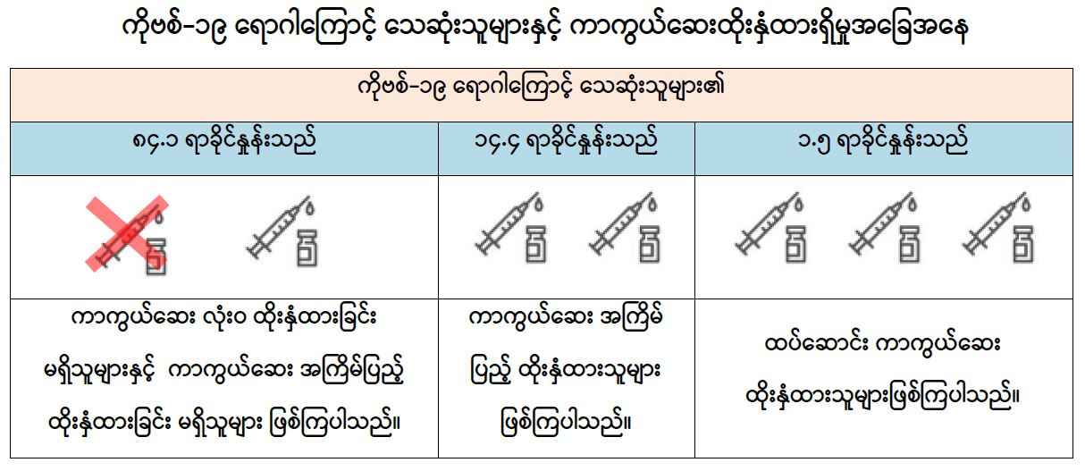 မြန်မာနိုင်ငံတွင် (၂၈-၁-၂၀၂၂) ရက်နေ့မှ (၇-၉-၂၀၂၂) ရက်နေ့အထိ တွေ့ရှိရသော ကိုဗစ်-၁၉ ရောဂါကြောင့် သေဆုံးသူများ၏ ကိုဗစ်-၁၉ ရောဂါ ကာကွယ် ဆေးထိုးနှံထားရှိမှု အခြေအနေများကို ဆန်းစစ်ချက်အရ ကိုဗစ်-၁၉ ရောဂါဖြစ်ပွားသူများ၏ (၈၄.၁) ရာခိုင်နှုန်းမှာ ကာကွယ်ဆေးလုံးဝ ထိုးနှံထားခြင်း မရှိသူများနှင့် ကာကွယ်ဆေး အကြိမ်ပြည့် ထိုးနှံထားခြင်းမရှိသူများ ဖြစ်ကြပြီး(၁၄.၄)ရာခိုင်နှုန်းမှာ ကာကွယ်ဆေး အကြိမ်ပြည့်ထိုးနှံထားရှိသူများဖြစ်ကာ (၁.၅) ရာခိုင်နှုန်းမှာ ထပ်ဆောင်းကာကွယ်ဆေး ထိုးနှံထားသူများဖြစ်ကြောင်း တွေ့ရှိရပါသည်။
