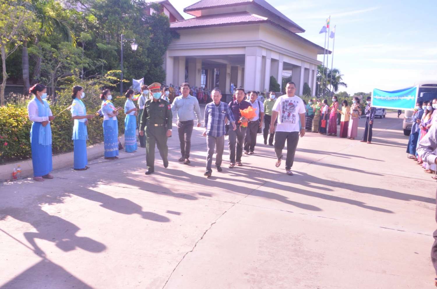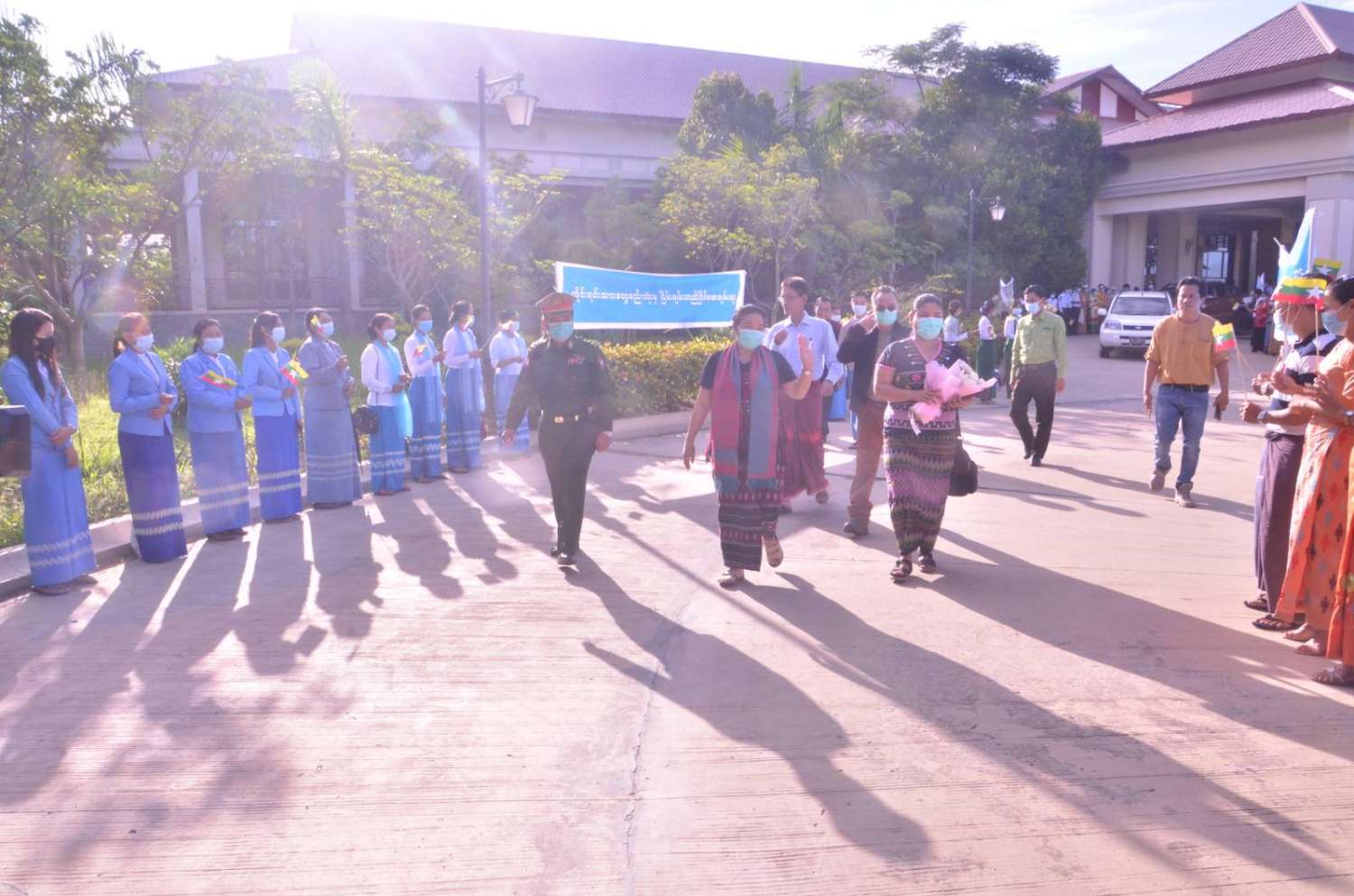 အဆိုပါ ငြိမ်းချမ်းရေး ကိုယ်စားလှယ်အဖွဲ့များအား အမျိုးသား စည်းလုံးညီညွတ်ရေးနှင့် ငြိမ်းချမ်းရေးဖော်ဆောင်မှု ညှိနှိုင်းရေးကော်မတီအဖွဲ့ဝင်နှင့် တာဝန်ရှိသူများ၊ သာသနာရေးနှင့် ယဉ်ကျေးမှုဝန်ကြီးဌာန အနုပညာဦးစီးဌာနမှ တိုင်းရင်းသား တိုင်းရင်းသူများ၊ ဌာနဆိုင်ရာ ဝန်ထမ်းများ၊ ငြိမ်းချမ်းရေးကို လိုလားသည့် ဒေသခံပြည်သူများက ထာဝရငြိမ်းချမ်းရေးကို ရရှိရေးသည် ပြည်သူတစ်ရပ်လုံး၏ ဆန္ဒအစစ်အမှန် ဖြစ်သည်၊ ငြိမ်းချမ်းရေး ရရှိရေးသည် နိုင်ငံသားအားလုံး၏ ဆန္ဒအမှန်ဖြစ်သည်၊ ပြည်ထောင်စုကြီးငြိမ်းချမ်းဖို့ တွေ့ဆုံဆွေးနွေး ကြပါစို့၊ တိုင်းရင်းသားတွေစည်းလုံးမှ ငြိမ်းချမ်းတည်ငြိမ်အေးချမ်းရစသည့် စာသားပါ ဆိုင်းဘုတ်များ ကိုင်ဆောင်၍လည်းကောင်း၊ နိုင်ငံတော်အလံငယ်များ ကိုင်ဆောင်၍ လည်းကောင်း ၎င်းတို့ တည်းခိုရာ Horizon Lake View Resort ၌ ပို့ဆောင်နှုတ် ဆက်ခဲ့ကြကြောင်း သိရသည်။
