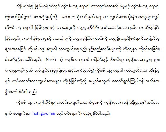 ကျန်းမာရေးဝန်ကြီးဌာနအနေဖြင့် နိုင်ငံအတွင်း ကူးစက်ဖြစ်ပွားနေသော COVID-19 ရောဂါ ကာကွယ်၊ ကုသ၊ ထိန်းချုပ်ရေးလုပ်ငန်းများကို အရှိန်အဟုန်မပြတ် ဆောင်ရွက်လျက်ရှိပါသည်။