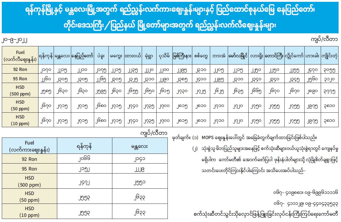 ရန်ကုန်မြို့နှင့် မန္တလေးမြို့အတွက် ရည်ညွှန်းလက်ကားဈေးနှုန်းများနှင့် ပြည်ထောင်စုနယ်မြေ နေပြည်တော်၊ တိုင်းဒေသကြီး/ပြည်နယ် မြို့တော်များအတွက် ရည်ညွှန်းလက်လီဈေးနှုန်းများ 09/20/2022