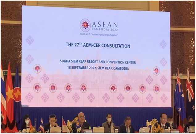 ကမ္ဘောဒီးယားနိုင်ငံ၊ ဆီရမ်ရိမြို့၌ ကျင်းပသည့် (၅၄) ကြိမ်မြောက် အာဆီယံ စီးပွားရေးဝန်ကြီးများ အစည်းအဝေးနှင့် ဆက်စပ်အစည်းအဝေးများ ကာလအတွင်း ၂၀၂၂ ခုနှစ်၊ စက်တင်ဘာ ၁၆ ရက်မှ ၁၈ ရက်အထိ ကျင်းပခဲ့သော အာဆီယံနှင့် ဆွေးနွေးဖက်နိုင်ငံများဖြစ်သည့် အိန္ဒိယ၊ ရုရှား၊ ကိုရီးယား၊ တရုတ်၊ အာဆီယံ+၃၊ အရှေ့အာရှ(EAS)၊ ဟောင်ကောင် (တရုတ်) (HKC)၊ ကနေဒါ၊ ဂျပန်၊ အီးယူ၊ အမေရိကန်၊ ဩစတြေးလျ၊ နယူးဇီလန် စီးပွားရေးဝန်ကြီးများ အစည်းအဝေးများ၊ ပထမအကြိမ် ဒေသတွင်း ဘက်စုံစီးပွားရေး ပူးပေါင်းဆောင်ရွက်မှု ဝန်ကြီးများအစည်းအဝေးနှင့် (၁၄)ကြိမ်မြောက် စီအယ်လ်အမ်ဗွီ (CLMV) စီးပွားရေးဝန်ကြီးများ အစည်းအဝေးသို့ မြန်မာနိုင်ငံ၏ အာဆီယံစီးပွားရေးဝန်ကြီးဖြစ်သူ ရင်းနှီးမြှုပ်နှံမှုနှင့် နိုင်ငံခြားစီးပွားဆက်သွယ်ရေးဝန်ကြီးဌာန၊ ပြည်ထောင်စုဝန်ကြီး ဒေါက်တာကံဇော် တက်ရောက်ဆွေးနွေးခဲ့သည်။