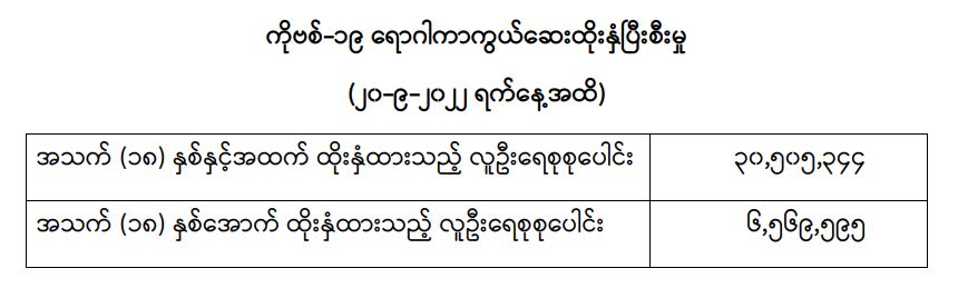 COVID-19 ရောဂါ ကာကွယ်ထိန်းချုပ်ရေးအတွက် တိုင်းဒေသကြီး/ပြည်နယ်များတွင် COVID-19 ရောဂါကာကွယ်ဆေးကို ဦးတည်အုပ်စုများသတ်မှတ်၍ ထိုးနှံပေးလျက်ရှိရာ (၂၀-၉-၂၀၂၂) ရက်နေ့အထိ အသက် (၁၈) နှစ်နှင့်အထက် လူဦးရေစုစုပေါင်း (၃၀,၅၀၅,၃၄၄) ဦးနှင့် အသက် (၁၈) နှစ်အောက် လူဦးရေစုစုပေါင်း (၆,၅၆၉,၅၉၅) ဦးတို့အား ထိုးနှံထားရှိပြီး ဖြစ်ပါသည်။